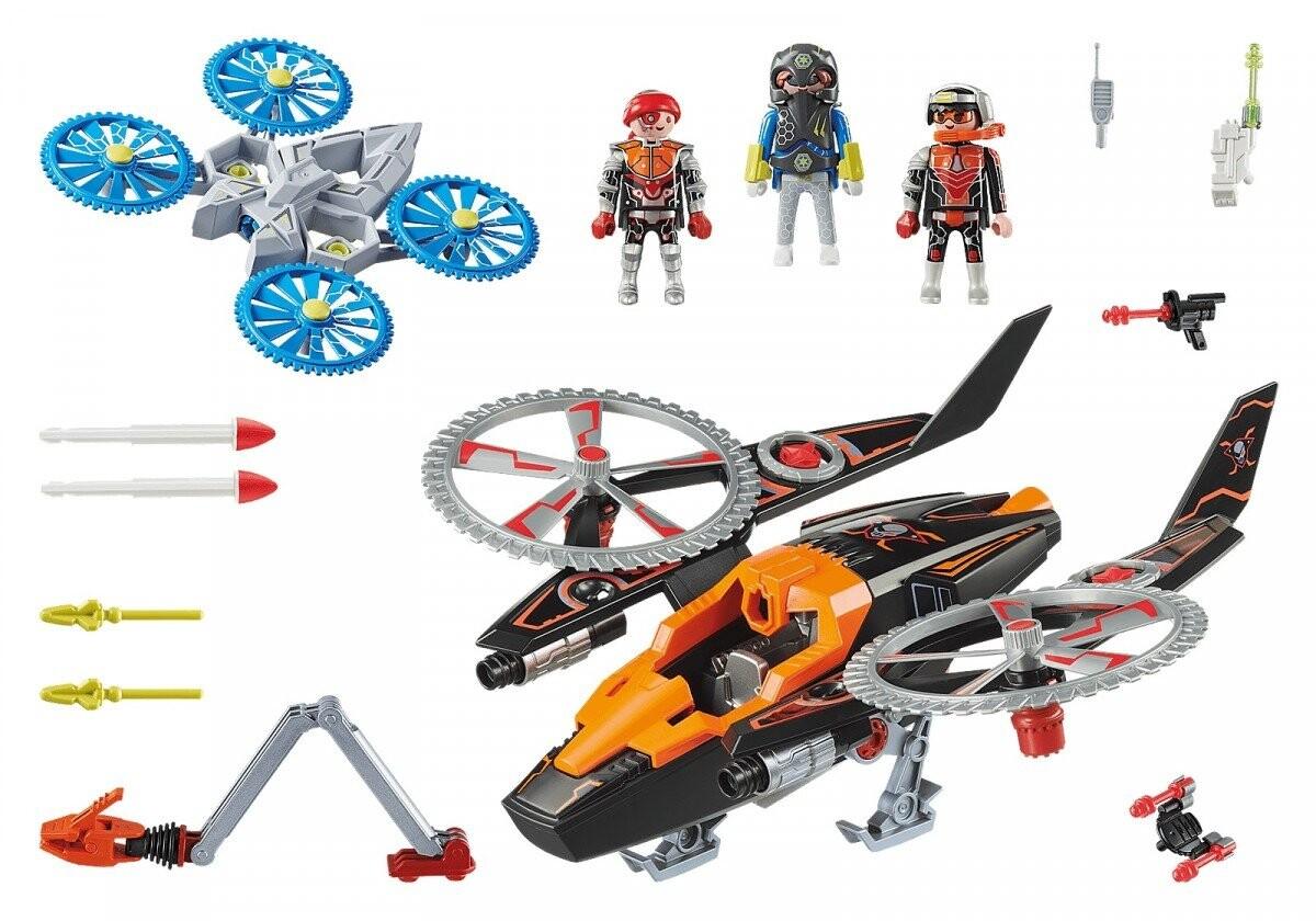 В игровой набор входят три фигурки PLAYMOBIL, космический полицейский и два космических пирата, вертолет с двумя ракетными установками и вращающимися боевыми винтами, а также летающий дрон.