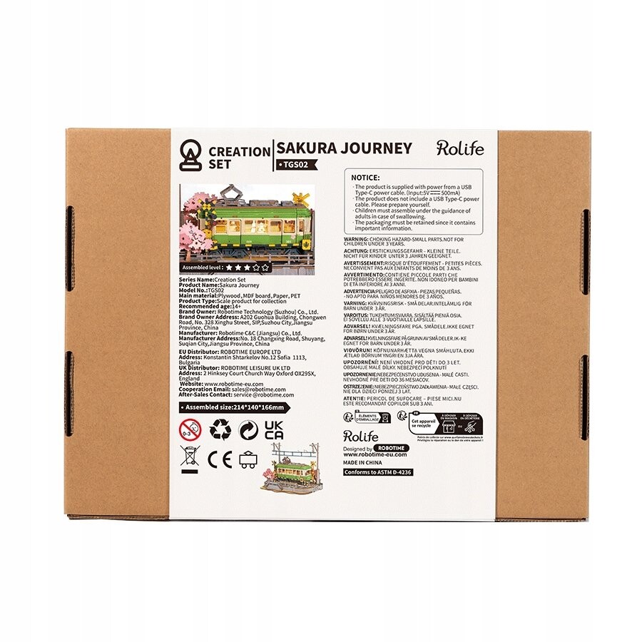 Вместе с продюсером Robotime в Японию, где во время цветения сакуры организуются традиционные пикники под деревьями сакуры, празднующие приход новой жизни. Японцы часто пользуются зеленым трамваем, чтобы добраться до этих мероприятий. 3D-модель от Robotime показывает именно такой трамвай на фоне цветущей сакуры. В наборе много точных элементов. которые можно соединить без использования клея или дополнительных сборочных приспособлений. Готовая модель непременно порадует каждого любителя моделирования. Конструкция оснащена светодиодной подсветкой, которую можно заряжать через кабель USB-C.