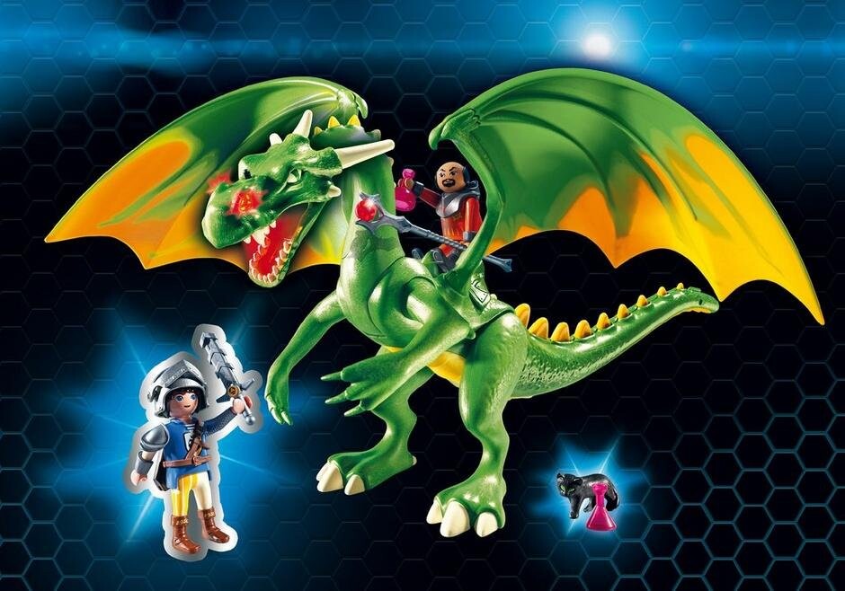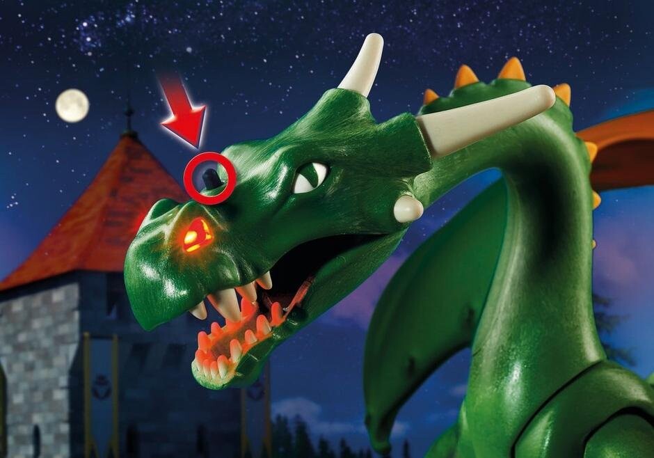 Мир рыцарей с Алексом, драконом и злым волшебником. Оснащен светодиодными световыми эффектами с функцией автоматического отключения питания. У дракона подвижные руки, ноги, крылья и шея. Поместите фигурку злого Волшебника Гриммагуса или рыцаря Алекса и начните свое приключение.