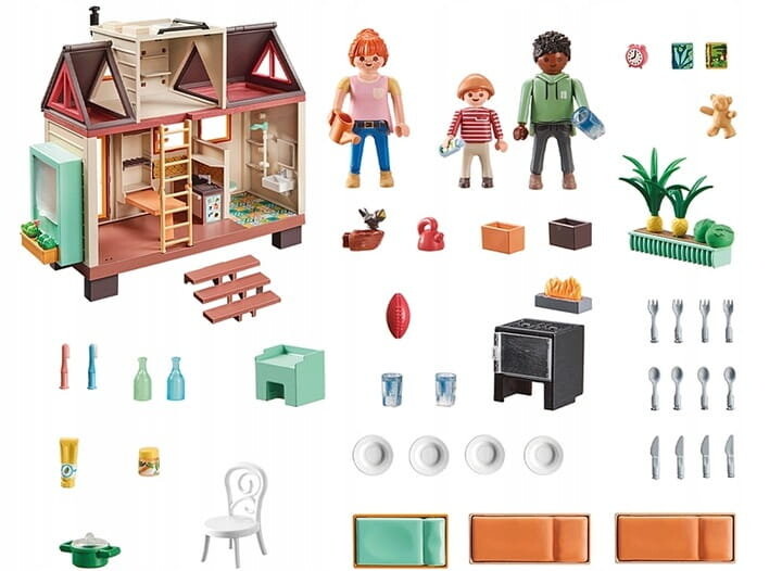 Маленький дом – большое семейное счастье! Перенеситесь в маленькую семейную идиллию с серией PLAYMOBIL Tiny House, созданной с учетом принципов устойчивого развития. В Tiny House есть все необходимое: на первом этаже столовая и кухня с плитой, раковиной и холодильником, а также раздвижной стол и ванная комната с душем и туалетом. Складная лестница ведет на чердак Есть детская комната и два спальных места для родителей. В саду выращиваются фрукты и овощи на приподнятой грядке и в цветочном ящике, а солнечные панели на крыше обеспечивают подачу электроэнергии. Этот маленький домик – мечта!