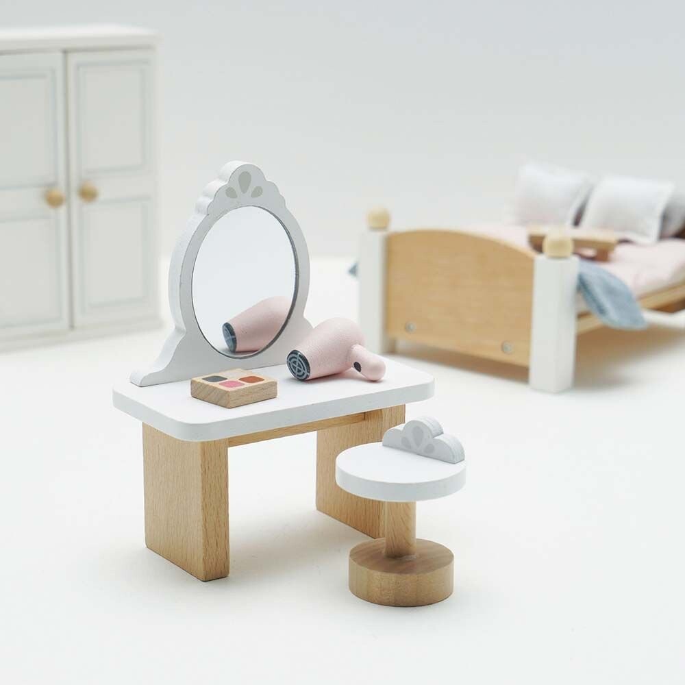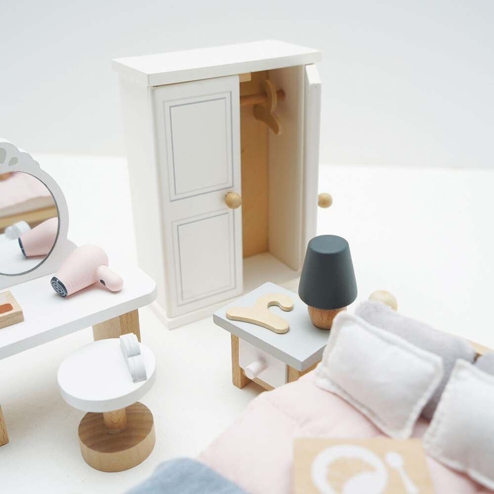 Благодаря классическому дизайну в красивых нейтральных тонах он совместим со всеми деревянными домиками Le Toy Van и станет впечатляющим дополнением к любой небольшой игровой площадке. Изготовлен из сертифицированной FSC древесины. Обеспечивает хороший ночной сон благодаря удобной двуспальной кровати с уютным пуховым одеялом и мягкими подушками, дополненными стильным покрывалом и деревянным подносом для подачи вкусного завтрака в постель. В комплект также входит отличный шкаф с вешалками, прикроватная тумбочка с лампой, а также красивый туалетный столик, табуретка и аксессуары для миниатюрных косметических процедур.