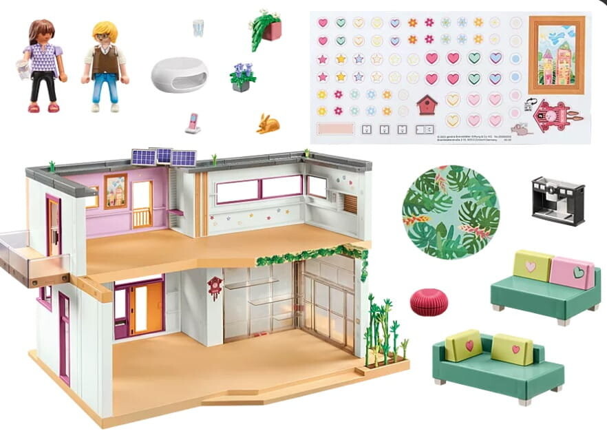 В комплект входят:Фигурки: 1 мужчина, 1 женщина Аксессуары : 1 дом в стиле Баухаус с 3 комнатами, зимним садом и балконом, 1 диван, 4 подушки, 1 табурет, 1 стол, 1 мобильный телефон, 1 ковер, 1 кофемашина с 2 стаканами для латте макиато, 1 виноградная лоза с виноградом и зелеными растениями, 3 солнечные панели Создайте дом своей мечты с набором «Домик в зимнем саду» от PLAYMOBIL. который был произведен с учетом принципов устойчивого развития. Современно обставленный дом способствует творческим ролевым играм.