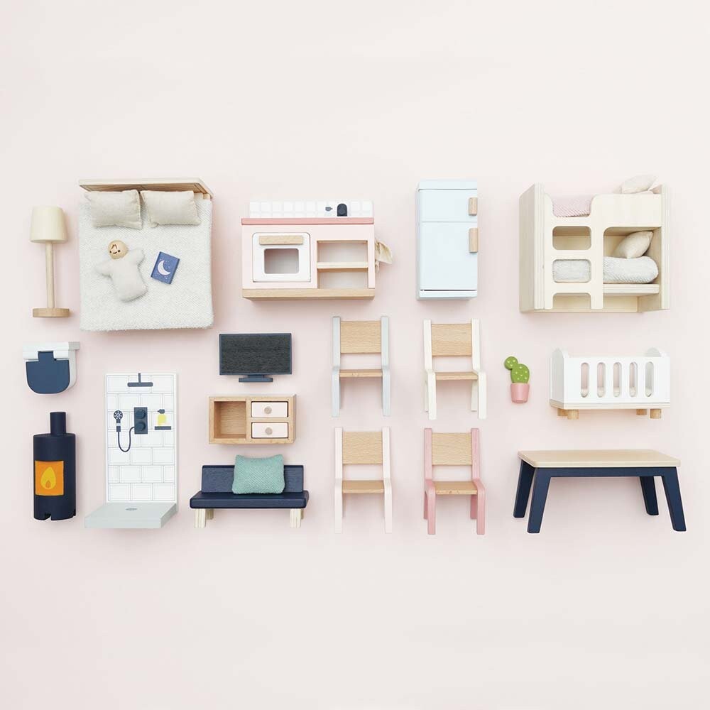Этот удивительный стартовый набор, отличающийся естественными мягкими тонами и большим количеством открытой древесины, включает в себя: кухню, гостиную с камином, спальню, ванную комнату, а также обеденный стол и стулья. Совместим со всеми красивыми деревянными кукольными домиками и аксессуарами Le Toy Van.