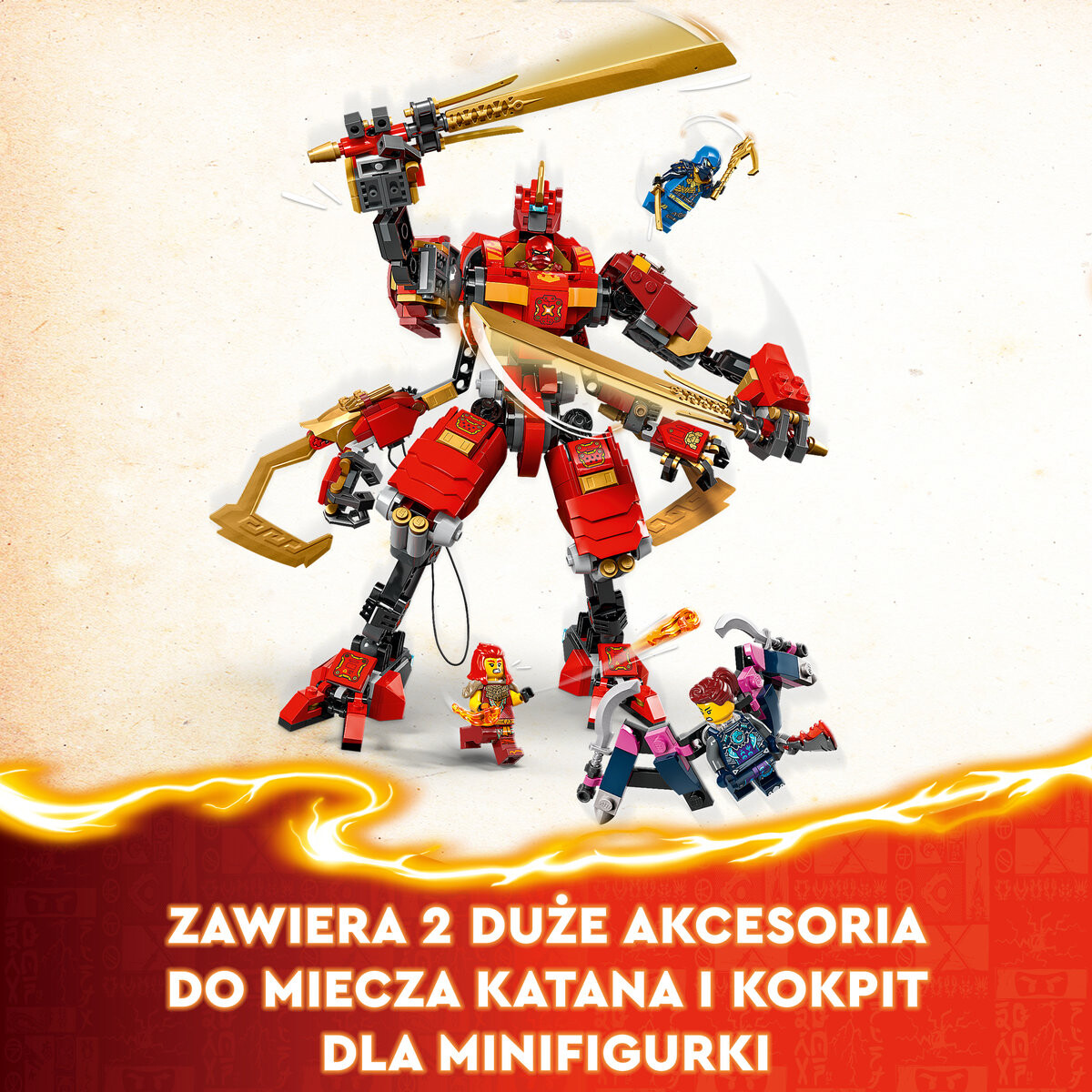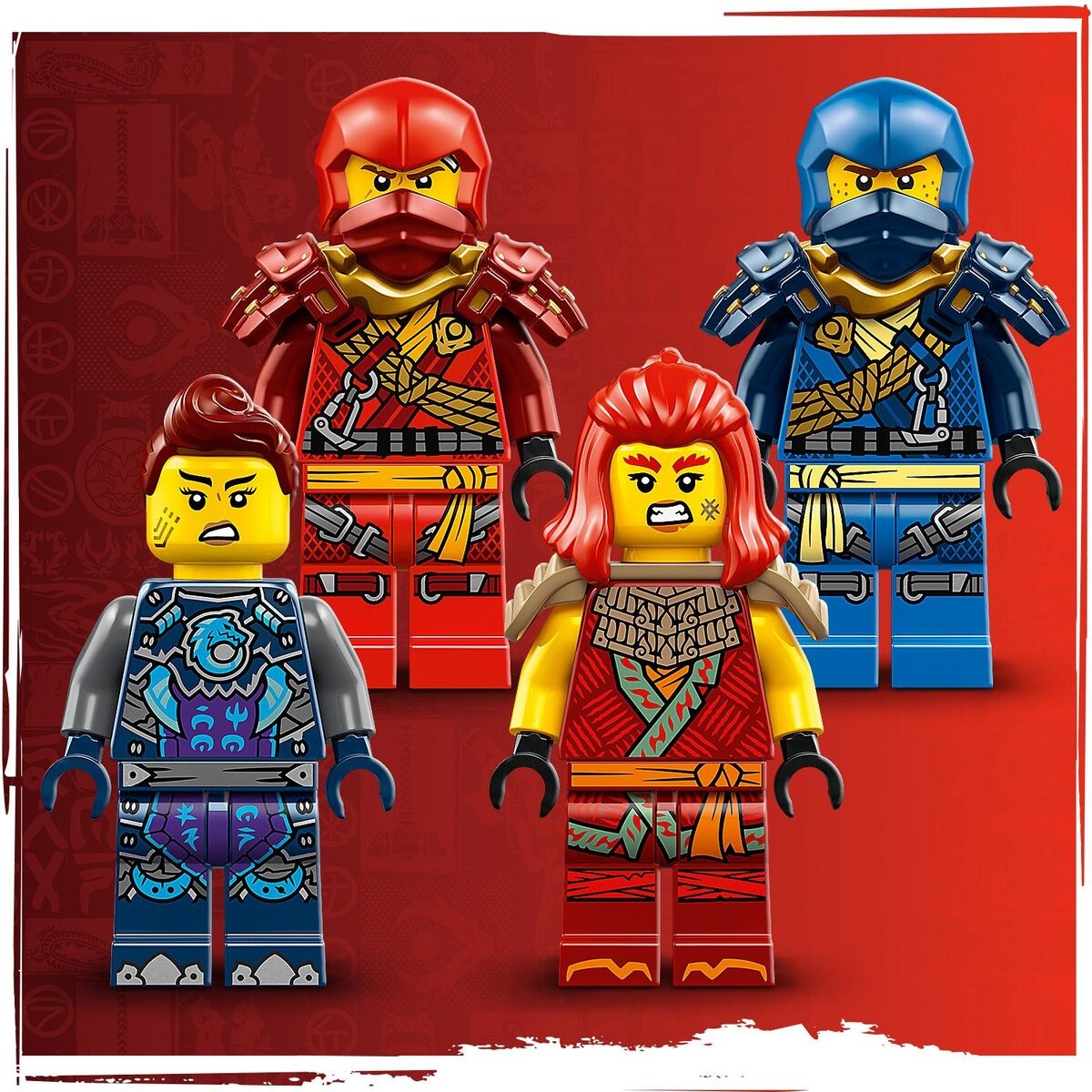 На задней части меха есть два больших крючка для ниндзя для игры и демонстрации.Четыре минифигурки NINJAGO