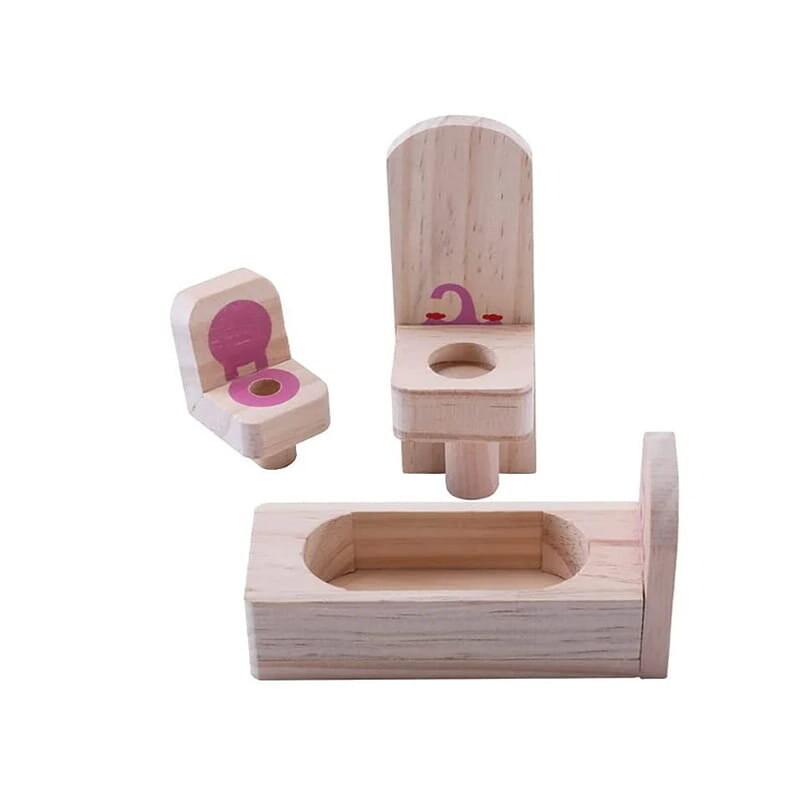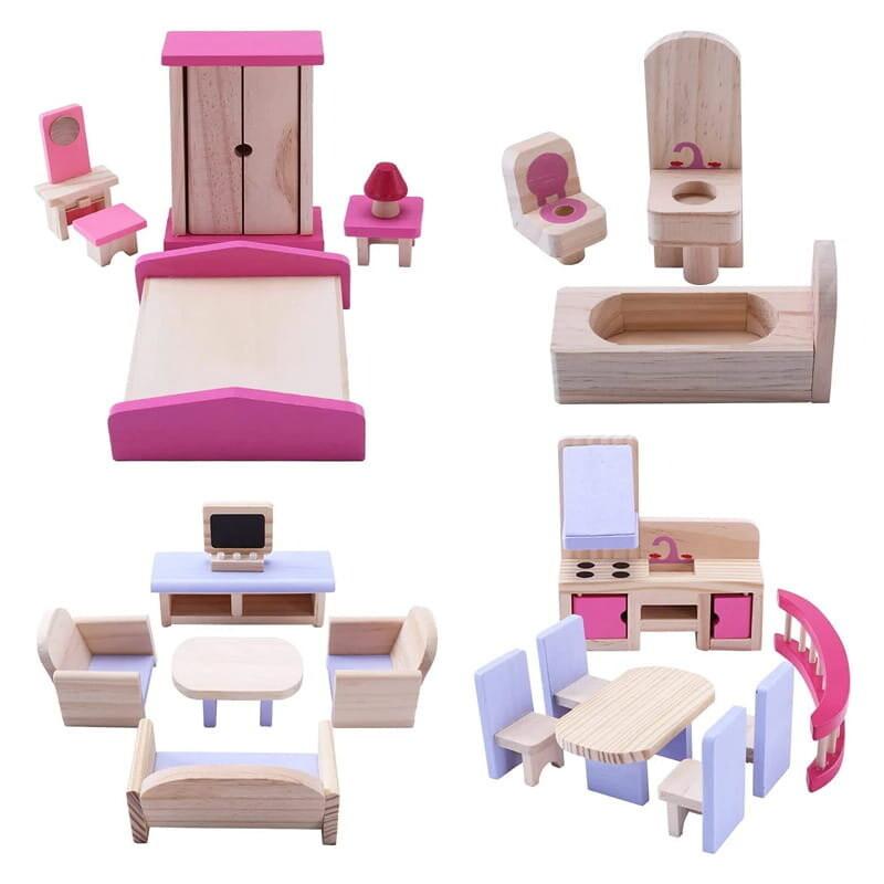 - деревянная мебель для кукольного домика - в комплект входят элементы для: гостиной, спальни, ванной комнаты, кухни