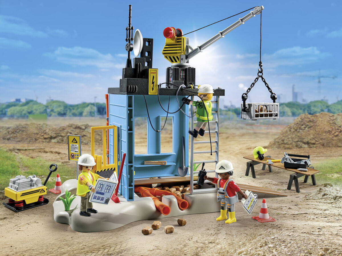 Строительная площадка. Фигурки: 1 женщина, 2 мужчины. Аксессуары: 1 перчатка, 1 альпинистская обвязка, 3 строительных каски, 1 наручные часы, 1 трамбовка бетона, 1 ящик для инструментов, 1 строительный стол, 1 веревочная лебедка, 3 силиконовых троса.