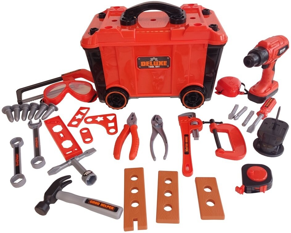 Из набора мы можем построить верстак и после игры превратить его в чемодан для инструментов, входящих в набор. В наборе 65 элементов, таких как детали для мастерской, инструменты, пила, отвертки, аккумуляторная дрель, большое количество шурупов и т. д.