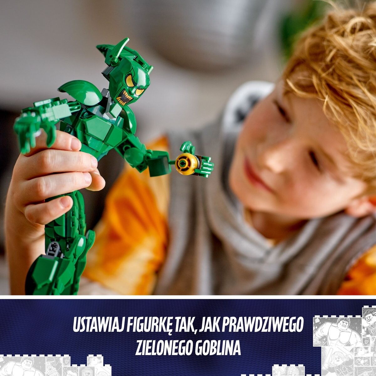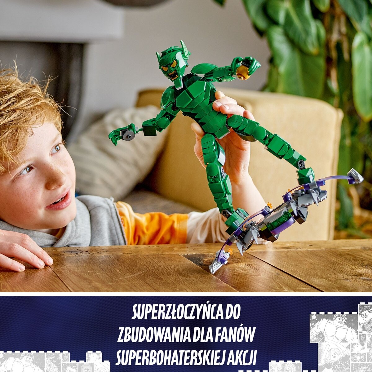 Дети могут изображать Зеленого Гоблина в динамичных позах, представляя, что он летает на планере и бросает тыквенные бомбы.Фигура Зеленого Гоблина LEGO MarvelПодвижная фигурка в действии