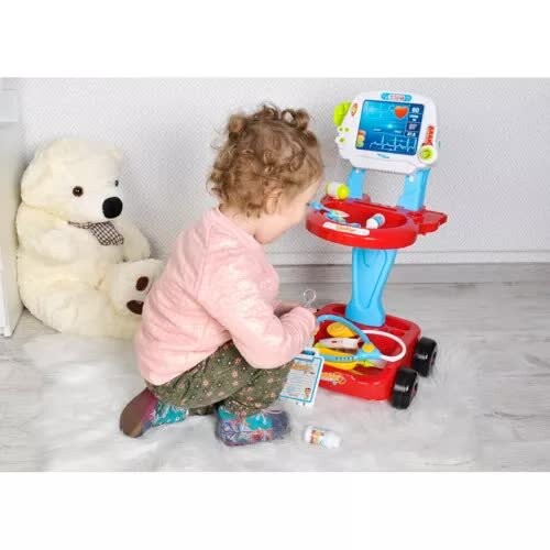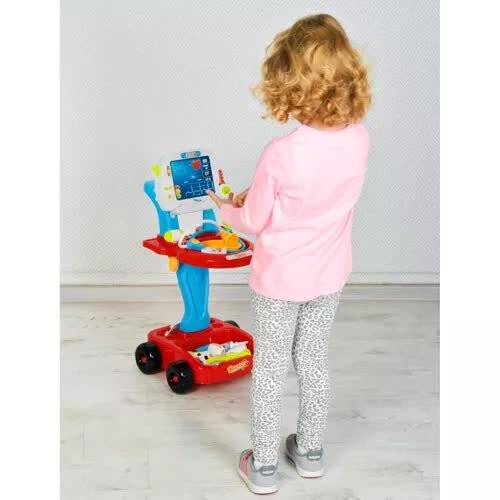 Комплект состоит из 18 элементов, которые помещаются в удобную и легкую 4-колесную тележку. Количество деталей позволяет практично использовать набор. Принадлежности врача и двухуровневая тележка с имитацией экрана ЭКГ и ручкой позволяют разнообразить и повторять игру. Благодаря «катанию» ребенок легко может переместить игрушку в другую комнату или взять ее в сад или на прогулку.