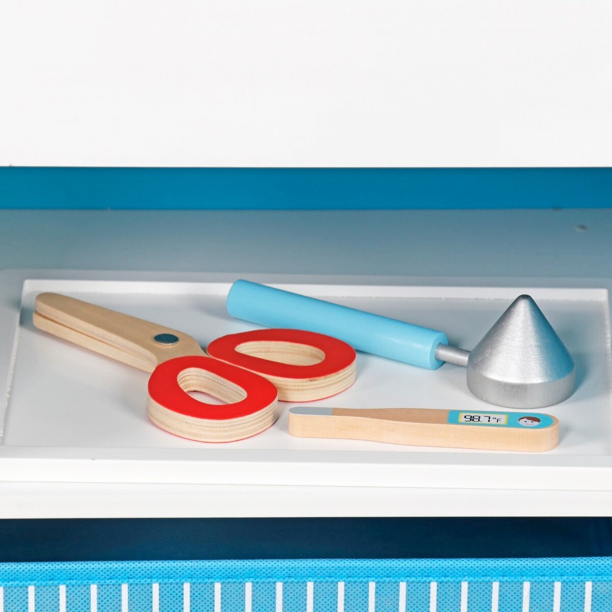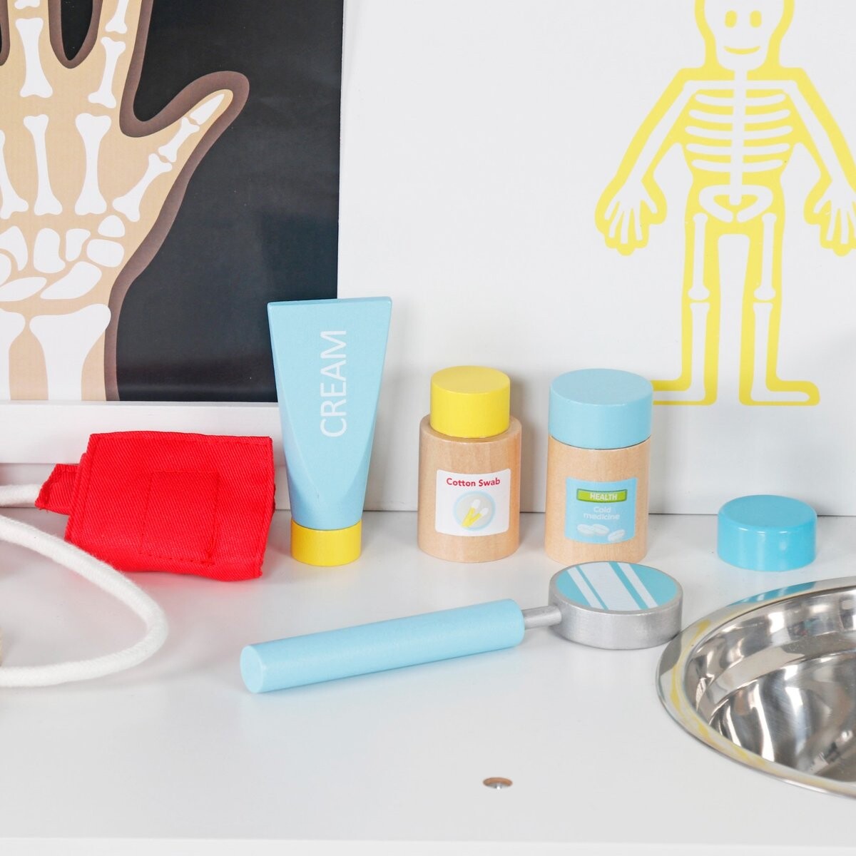 • Практические элементы: деревянный ящик, 2 корзины для хранения, лоток для транспортировки инструментов. Медицинский, медицинский. Папка с блокнотом, кремом и Ножницы, бутылочка с лекарством и баночка с ватным тампоном.