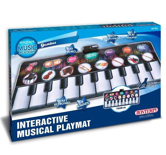 Интерактивный музыкальный коврик на 10 клавиш. Содержит 8 предварительно загруженных звуков и 10 демонстрационных песен. Возможна регулировка громкости. С функцией записи и воспроизведения и функцией обучения OKON. Коврик питается от 3 батареек R6/AA 1,5 В (не входят в комплект).