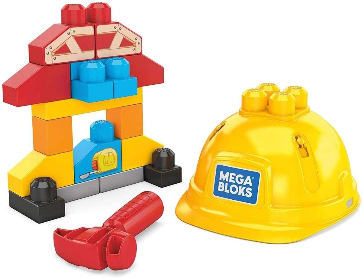 Блоки могут располагаться по-разному. Ребенок может почувствовать себя на настоящей стройке благодаря желтому шлему и красному молотку, входящим в комплект. что облегчит соединение блоков.