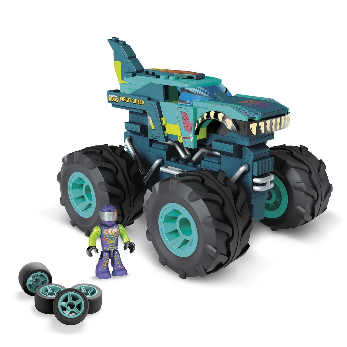 В набор входят блоки, которые позволят вам собрать автомобиль Mega Wrex, вдохновленный оригинальной моделью Monster Truck. Автомобиль, оснащенный огромными подвижными колесами и кузовом в форме головы динозавра с зубами.
