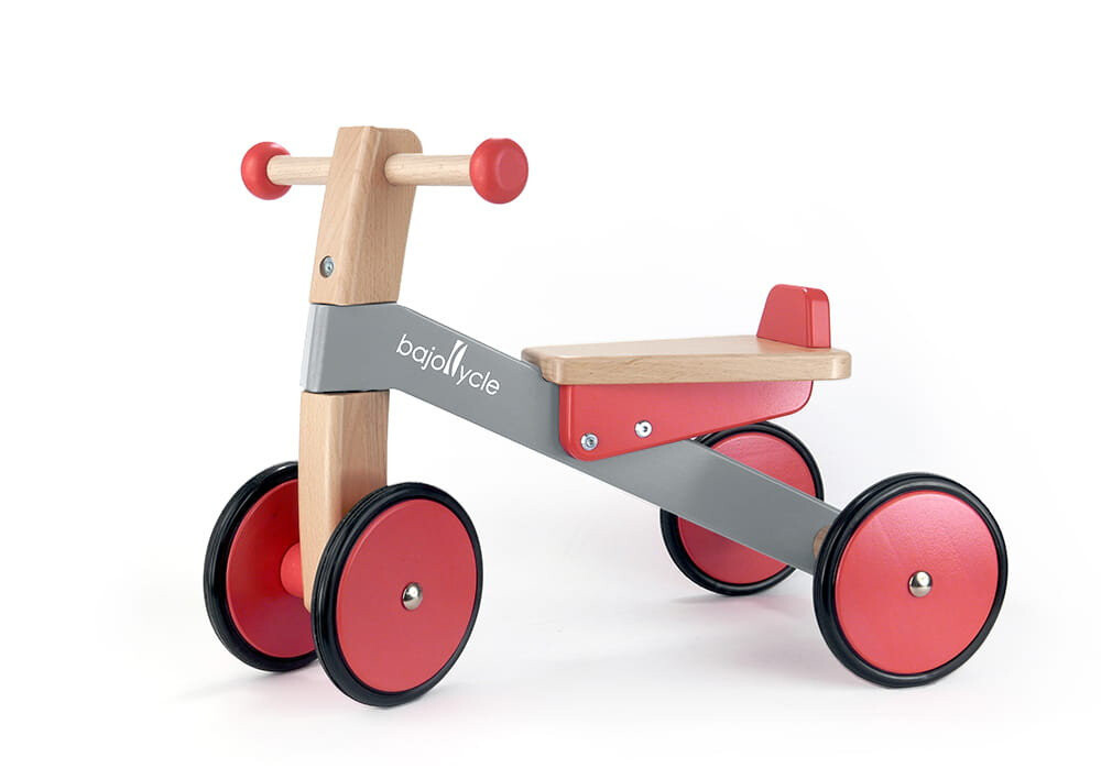 Ноги маленького ребенка. Велосипед Bajo идеально подходит для роли первого транспортного средства ребенка. Удобное широкое сиденье, поворотное рулевое колесо, устойчивость и надежность, а также 4 колеса с резиновым покрытием, повышающие комфорт вождения и защищающие стены и полы от царапин. Езда на велосипеде развивает мануальные навыки и способствует развитию крупной моторики, включая движения рук и тела, а также влияет на развитие чувства равновесия.