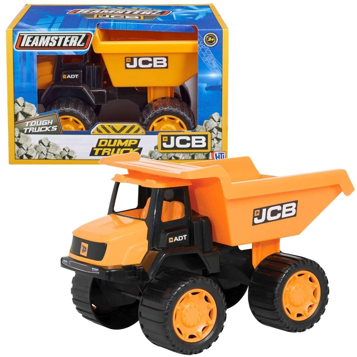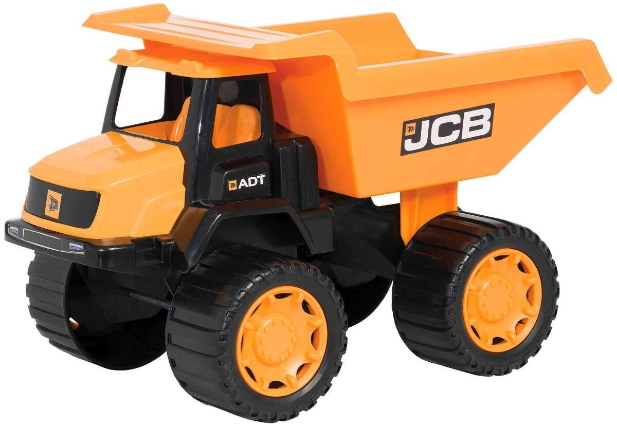 Самосвал имеет желтый корпус с черными элементами. У него есть большой трейлер, в который все соберут. Благодаря большим колесам неровные дороги для нее точно не станут испытанием!
