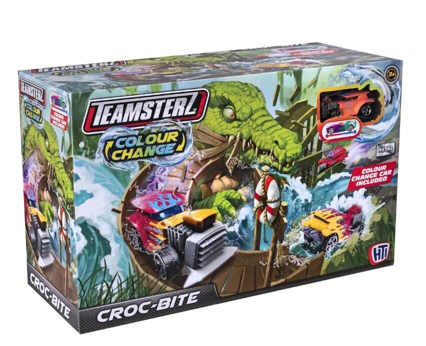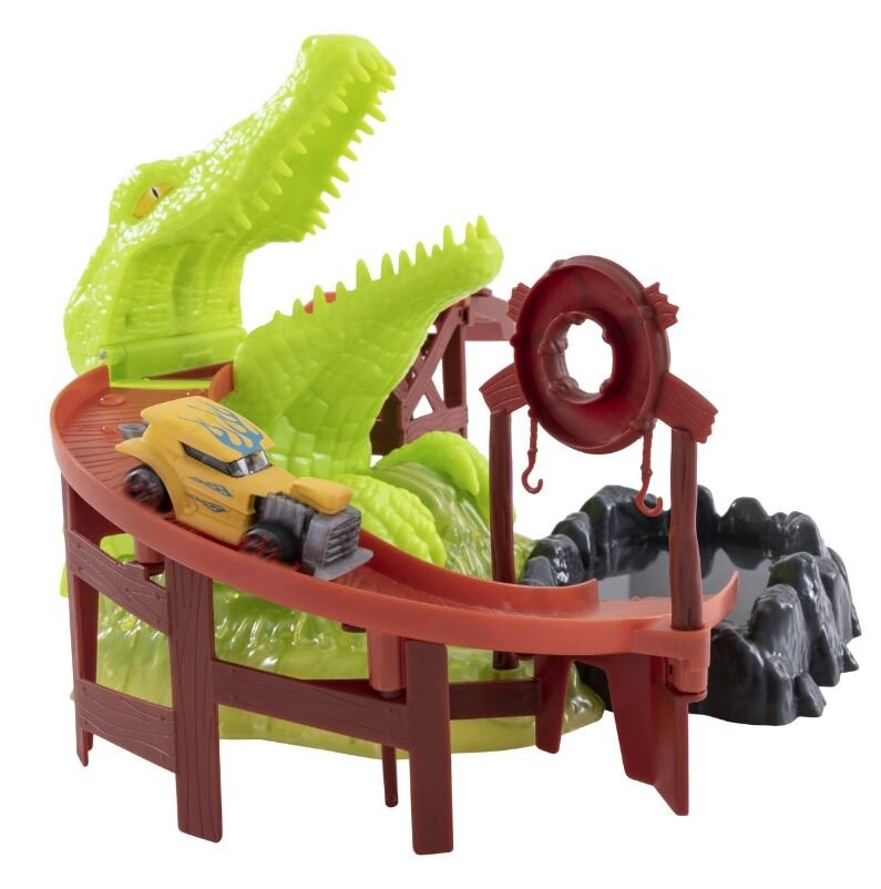 Автомобильная трасса Crocodile Jaws — очень увлекательная поездка! В середине трассы стоит челюсть крокодила, готовая съесть машину. В самом конце трассы находится лужа с водой, из-за которой автомобили из металла меняют цвет краски под воздействием горячей/холодной жидкости! Машина адаптирована к маленьким ручкам ребенка. Это отличный товар для маленького водителя, развивающий моторику.