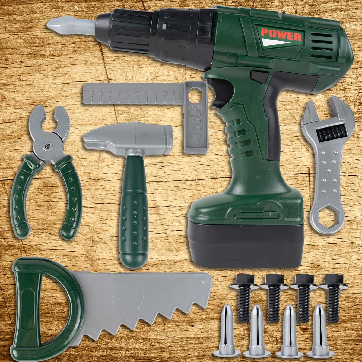 Дрель питается от двух батареек типа АА. При нажатии сверло вращается вперед или назад в зависимости от выбранного направления. Специальный переключатель меняет вращение слева направо, а аксессуары, входящие в комплект, сделают игру еще увлекательнее!