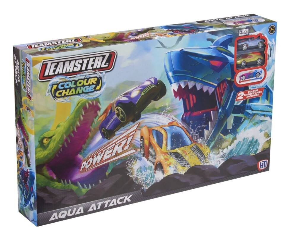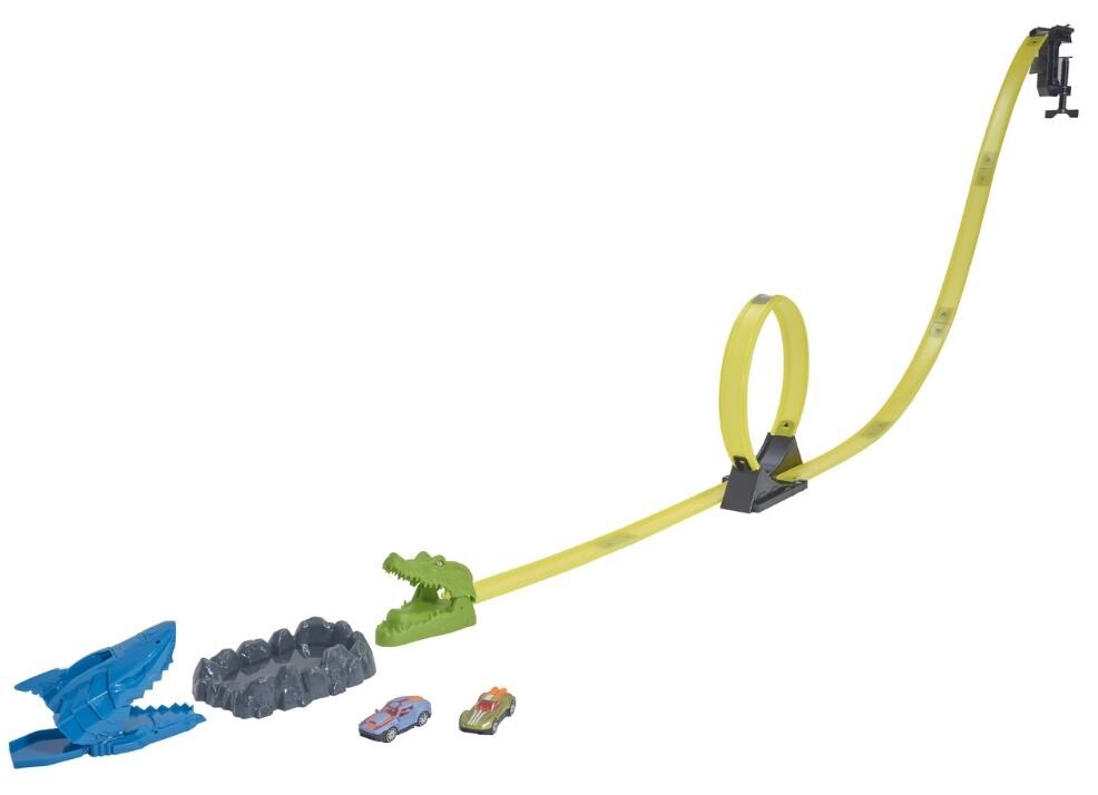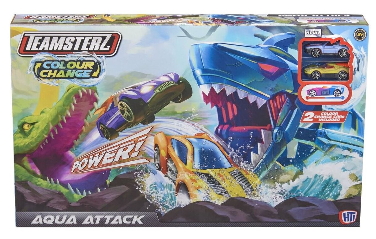 Мчитесь по трассе, вокруг петли и сквозь пасть акулы, прежде чем приземлиться в воду, которая меняет цвет машины, но будьте осторожны - на другой стороне огромный крокодил! Автомобили покрыты специальным лаком, который меняет цвет при погружении в горячую/холодную воду! Это идеальный продукт для любого увлеченного маленького водителя, предлагающий часы творческих развлечений. Игрушка поддерживает развитие и моторику ребенка. В комплект входят 1 акула, 1 крокодил, 1 рампа, контейнер для воды и 2 машинки.