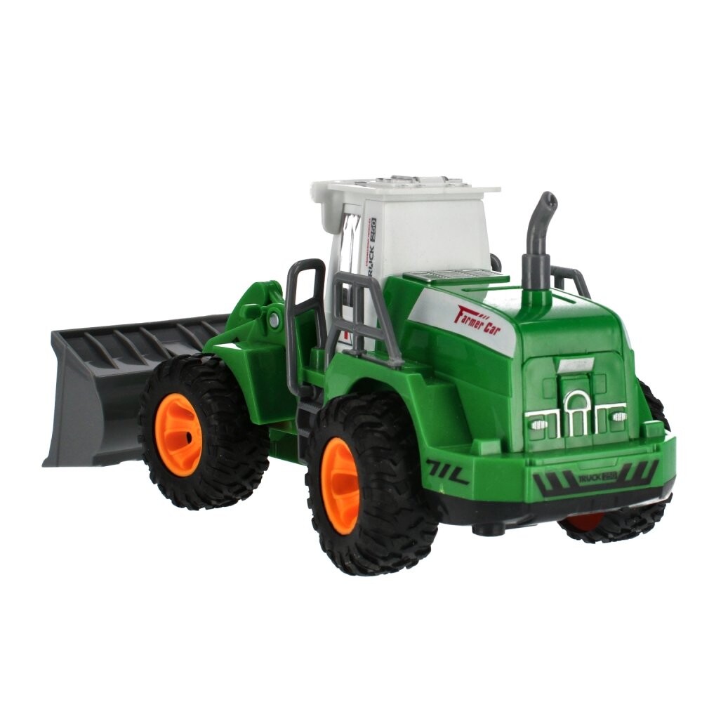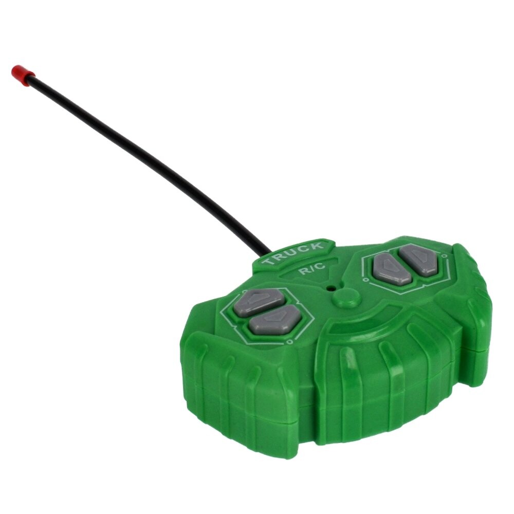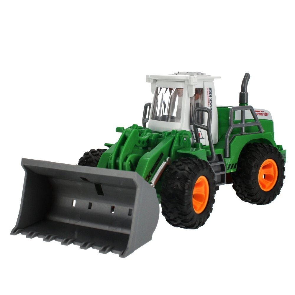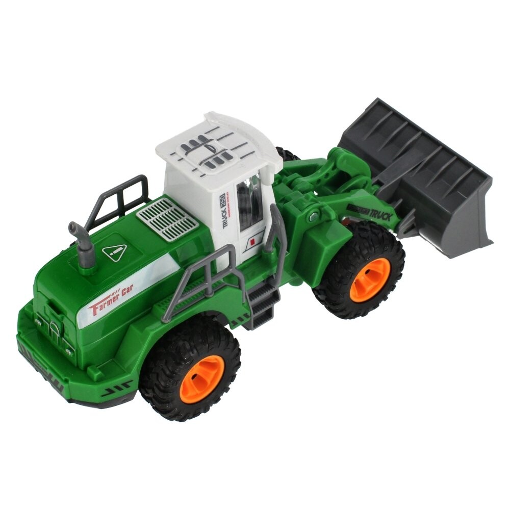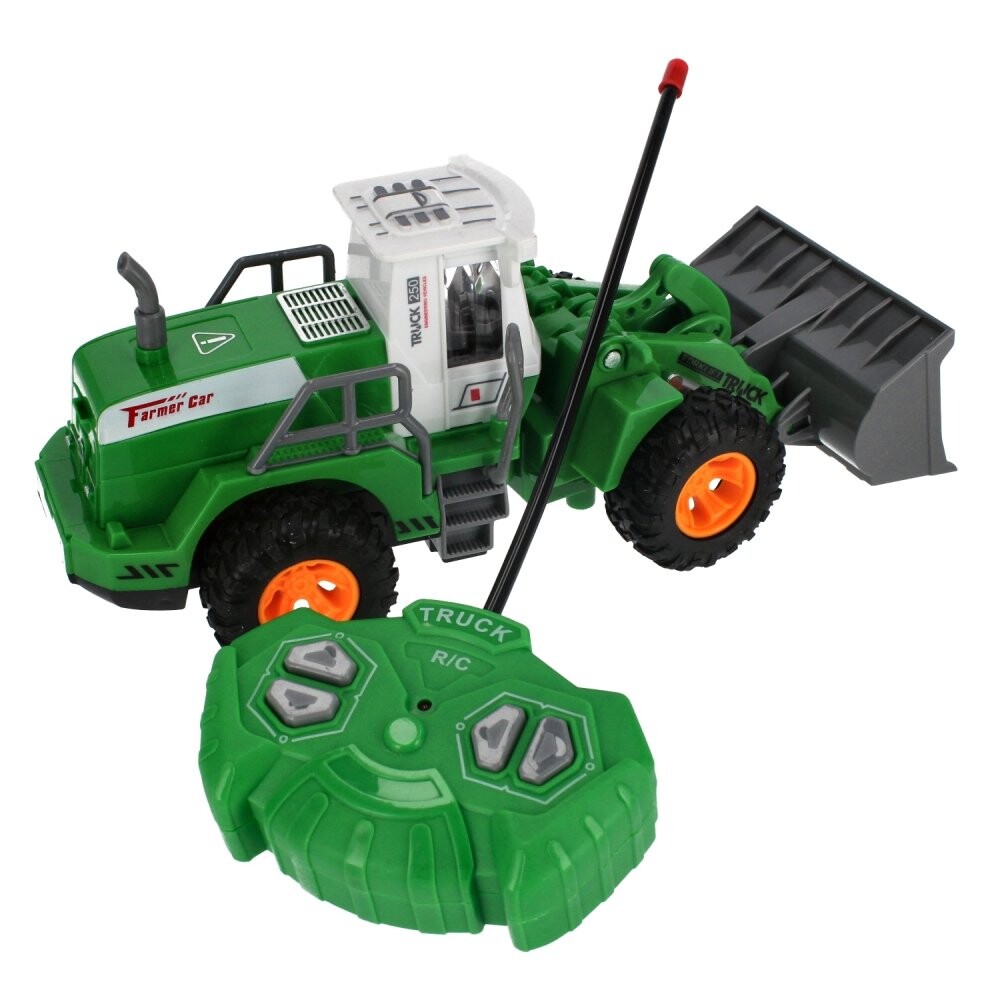 Трактор с дистанционным управлениемимеет зеленый корпус с белыми и серыми элементами.