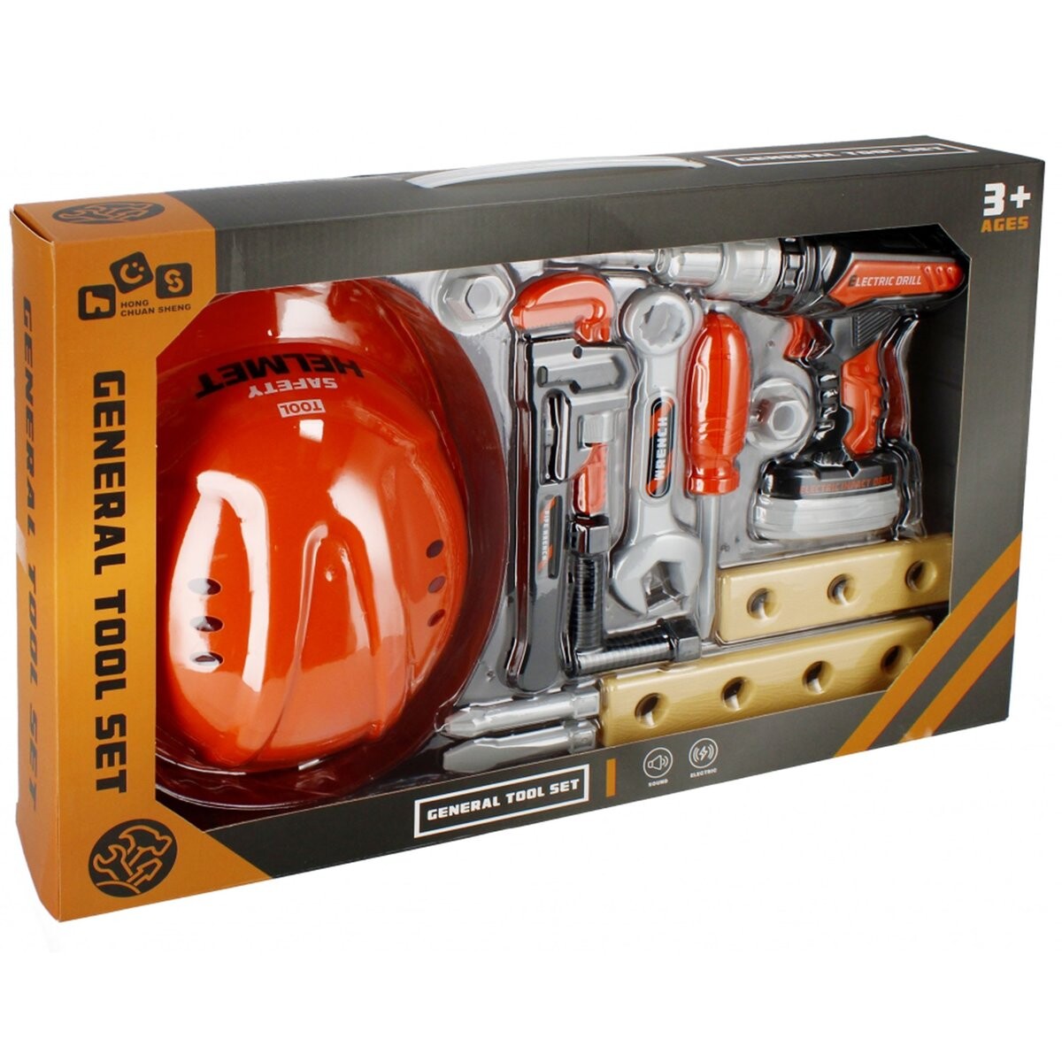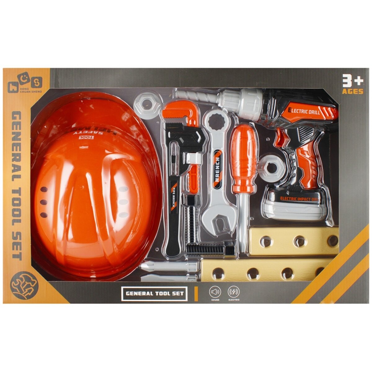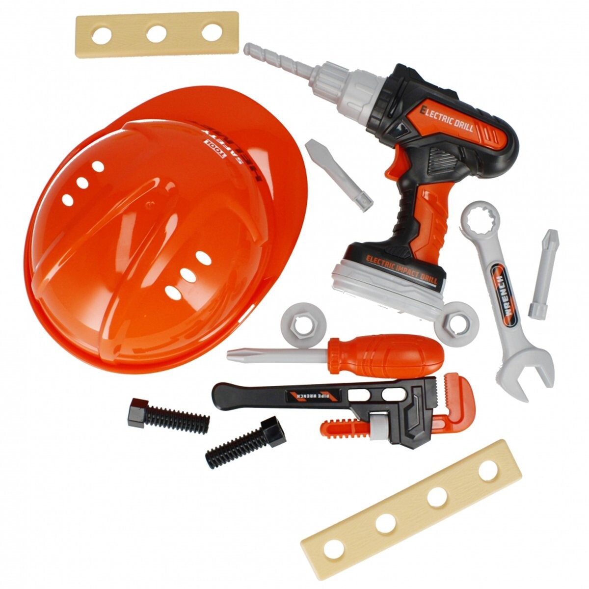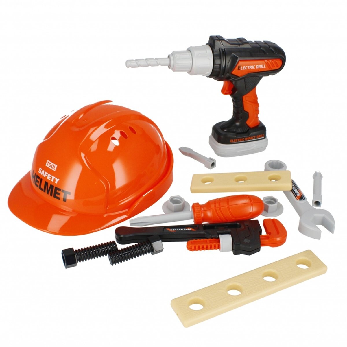 В комплект входят каска, дрель с подвижным сверлом, отвертка с двумя насадками, гаечный ключ, гаечный ключ, шурупы с насадками и две доски. .