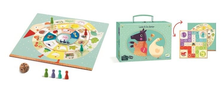 В настольную игру «Гуси» от DJECO могут играть от двух до четырех игроков. Доска двусторонняя — на другой стороне игра «Лошади» (правила аналогичны китайской игре). Все это хранится в удобном чемодане.