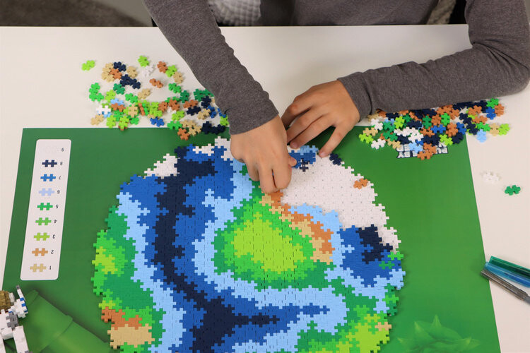 Глобус выполнен из 800 мини-блоков Plus-Plus, размеры после расстановки: 39 х 38 см