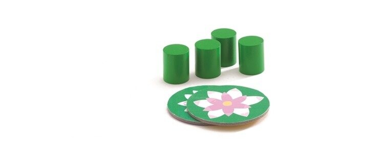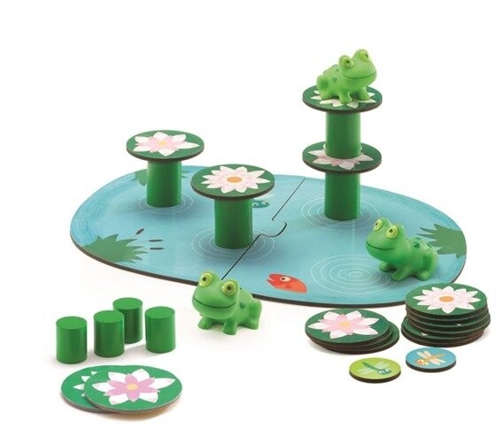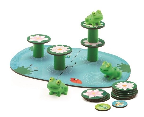 Маленькие лягушки балансируют над поверхностью пруда на конструкциях, построенных из прикрепленных кольев и цветов лилии. Будьте осторожны, не дайте им упасть в воду!