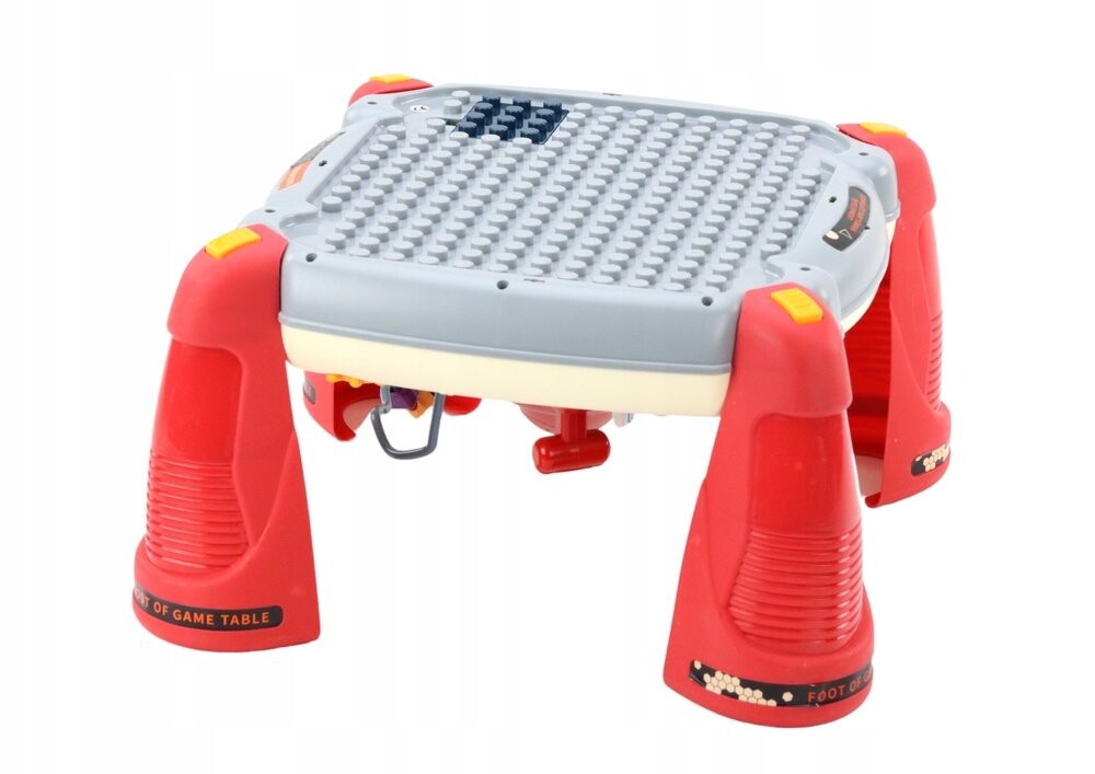 Развивающий стол стоит на четырех красных ножках, которые можно отсоединить, что позволяет играть прямо на полу. Кроме того, на другой стороне стола есть выступы, которые позволяют складывать блоки друг на друга и сенсорно играть.