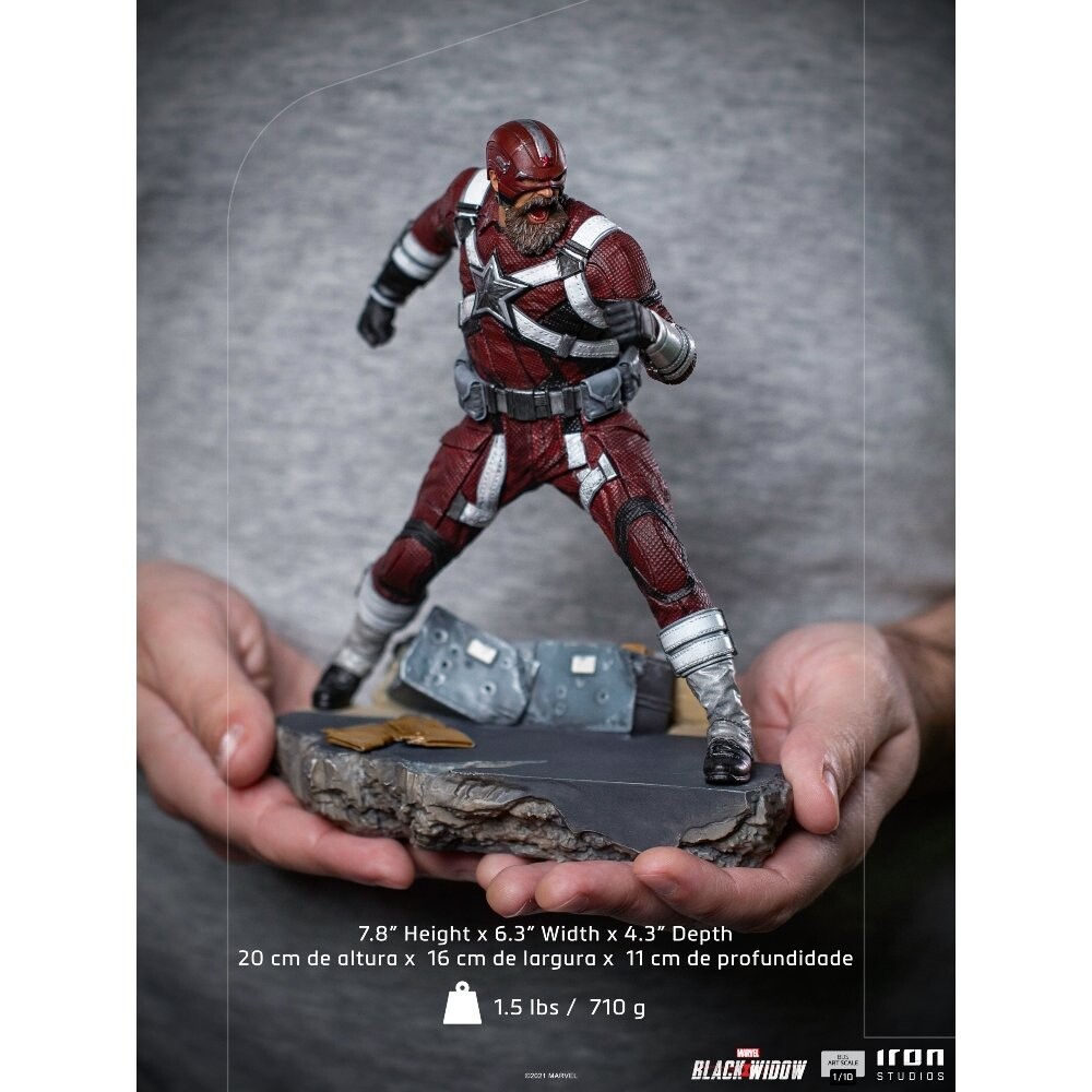 В позе, как будто он яростно кричит, длинноволосый российско-советский суперсолдат стоит готовым к бою, гордо одетый в свою патриотическую красную форму, символ своей нации. Гигант продвигается по папкам и ящикам с испорченными документами на полу базы, готовый встретиться лицом к лицу с любым врагом перед ним со сжатыми кулаками и защитить своих союзников-протеже от угрозы таинственного злодея, Надсмотрщика. прям как в фильме «Черная вдова». Итак, Iron Studios представляет свою фигурку великого «Red Guardian BDS Art Scale 1/10 — Black Widow — Iron Studios».