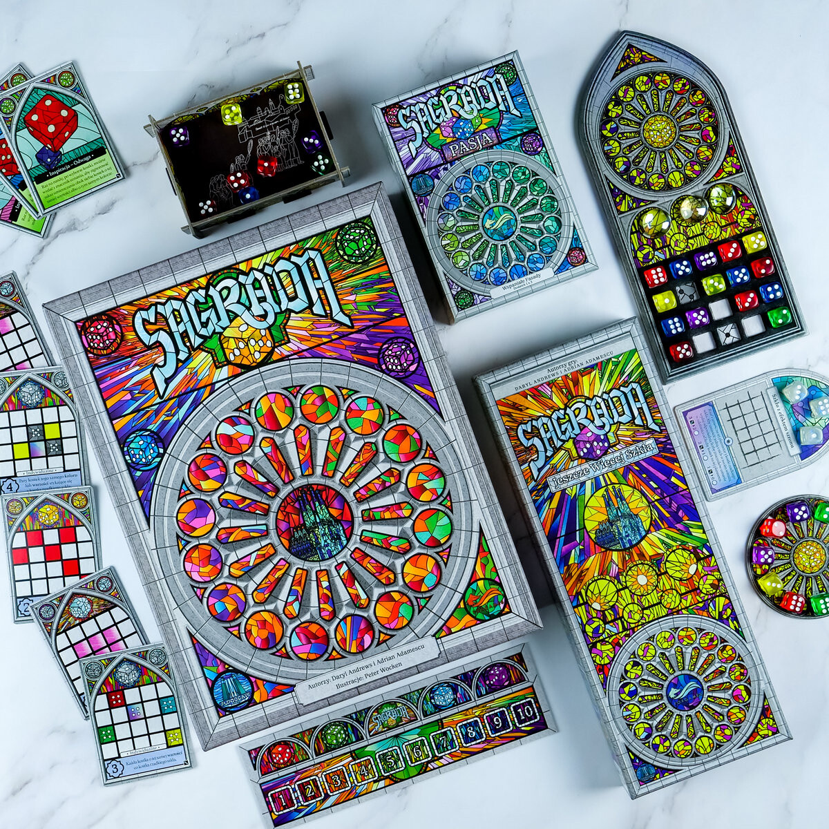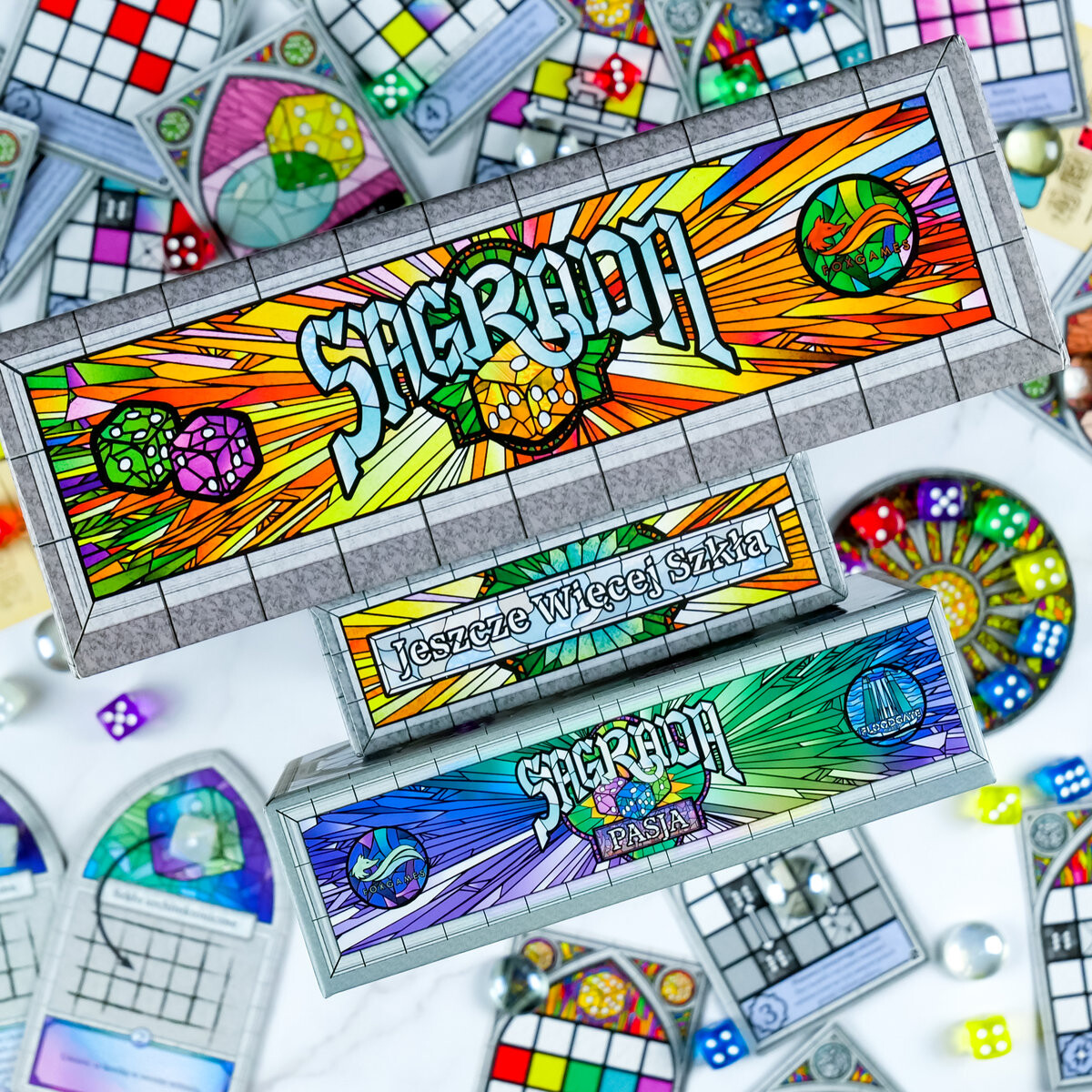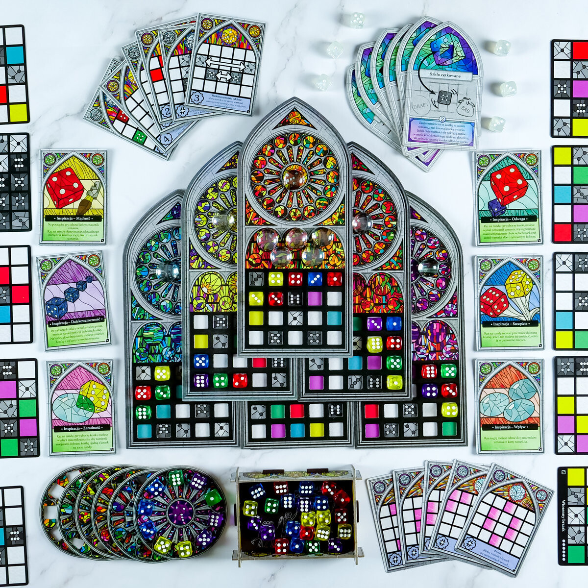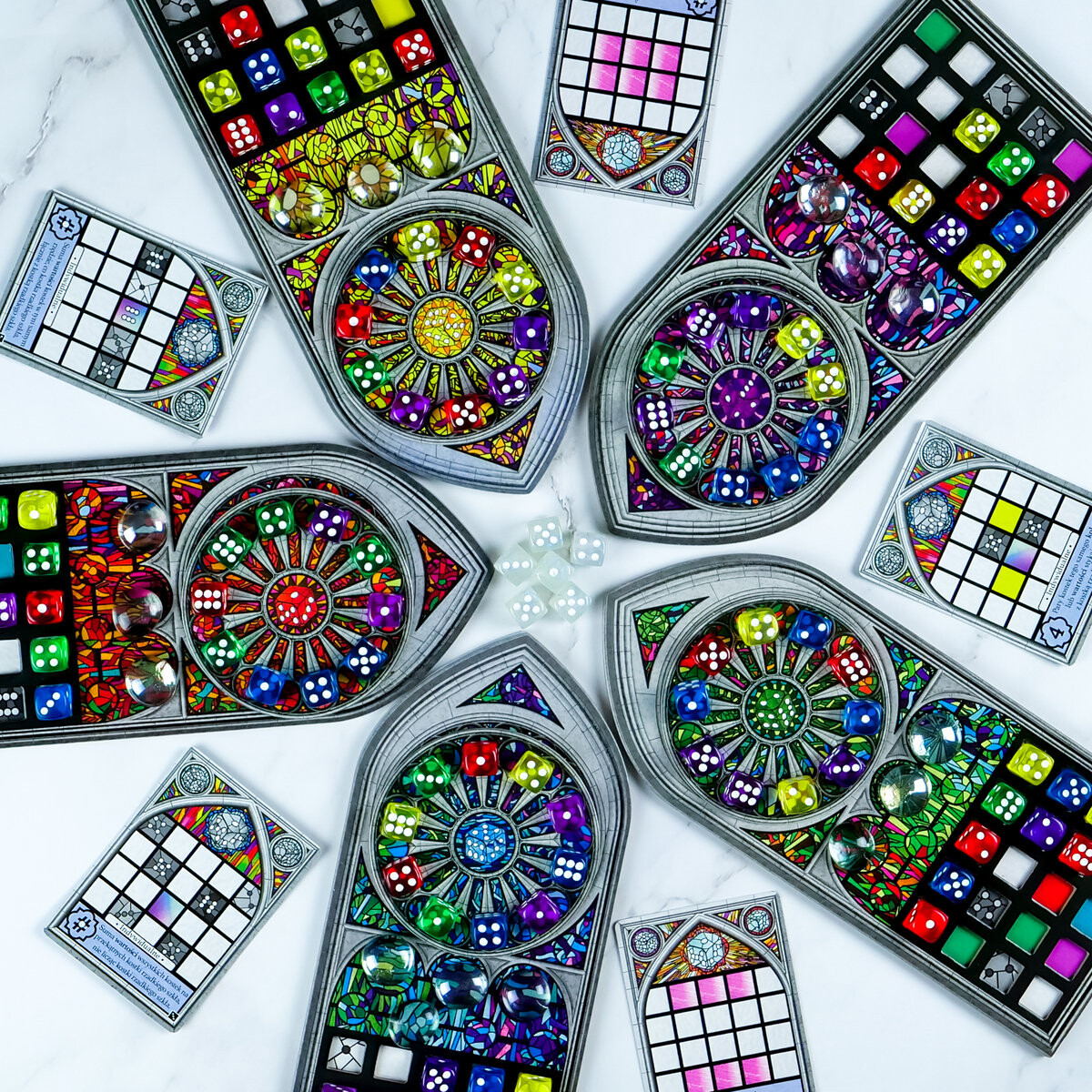 Дополнительные рамки и наборы кубиков позволят играть до 6 человек, а также новые карты целей. инструменты и витражи разнообразят игровой процесс. Также вас ждет совершенно новый элемент механики — личный стеклянный ресурс. В коробке также имеется привлекательный лоток для кубиков.
