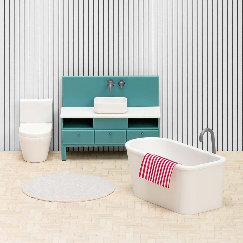 Ванная комната, которая понравится семье, живущей в кукольном домике! Модуль умывальника оснащен красивым умывальником и двумя открытыми шкафчиками для практичного хранения. Разместив стильную ванну в центре ванной комнаты кукольного домика или рядом со стеной, вы создадите элегантное пространство для купания. Крышка унитаза открывается и закрывается. В комплект также входит круглый коврик для ванной и полотенце.