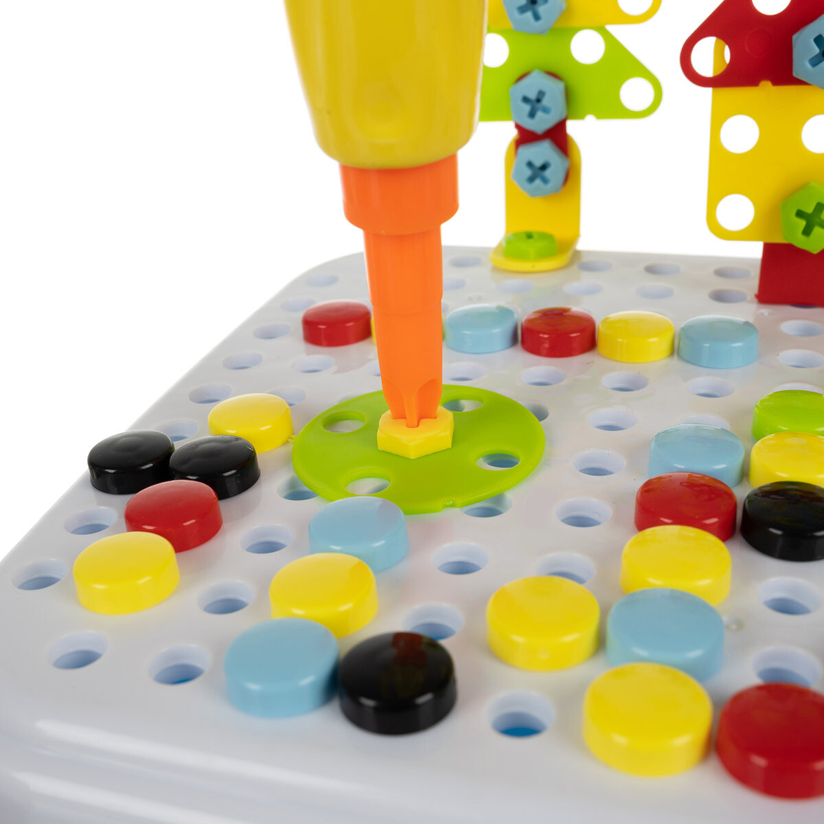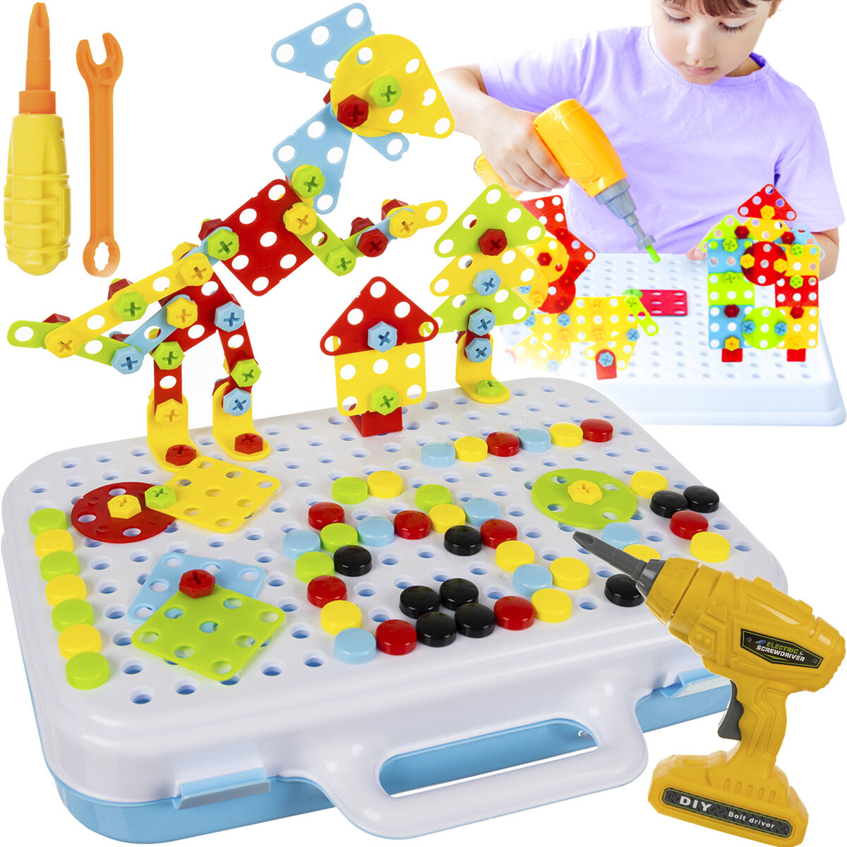 Креативная мозаика – отличный способ развлечься всей семьей. Это даст возможность родителям интересно провести время с детьми дома и избавит от скуки, особенно когда за окном неблагоприятная погода. В комплект входит чемодан с мозаикой сверху. Внутри находится сверло с наконечником, цветные шайбы (х64) и винты (х40). Отвертка работает от батареек. позволяет вкручивать и вынимать винты! Это непременно доставит каждому ребенку огромное удовольствие и побудит его к игре. Креативная мозаика позволит вашему ребенку создавать множество разных картинок и особенно понравится любителям DIY. Яркие и контрастные цвета привлекают внимание ребенка и повышают интерес к игрушке. ПРЕИМУЩЕСТВА