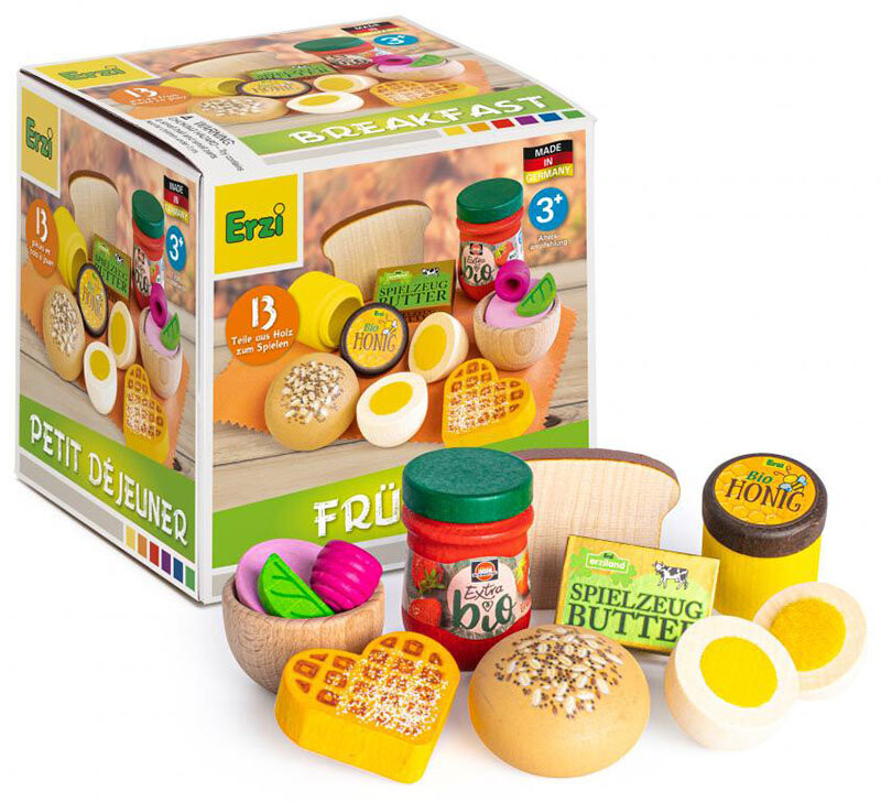 Деревянный набор «Завтрак» от Erzi позволит вашему малышу приготовить самый важный обед дня для членов семьи или игрушек. Каждый из 13 элементов набора изготовлен из безопасной и прочной древесины бука. Игровая еда выглядит чрезвычайно реалистично, что доставляет массу удовольствия. В набор входят: 1 зерновая булочка, 1 тост, 1 вафля в форме сердца, 1 палочка сливочного масла, 1 клубничный джем «Швартау», 1 баночка меда, 2 половинки яйца для резки (на липучке, имитирующей желток), 1 стакан фруктовый чай, 1 малина, 1 лист мяты.