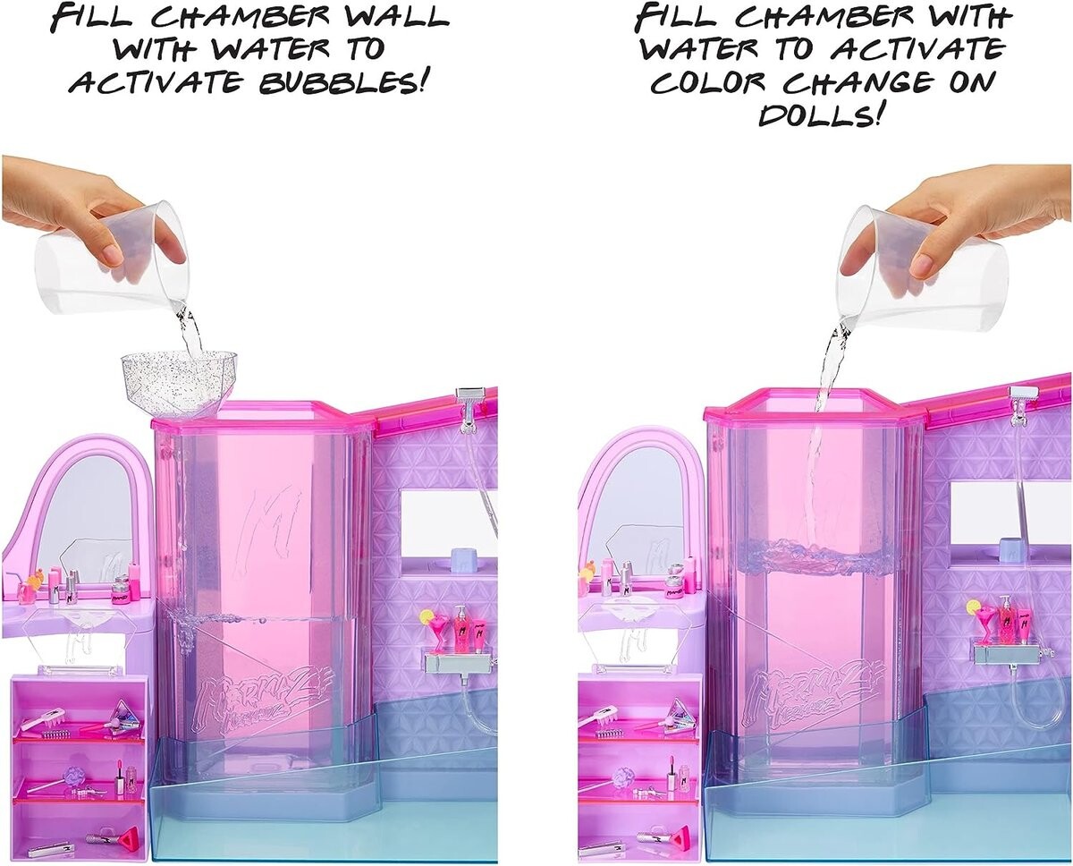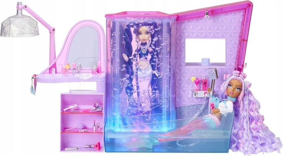 Время немного расслабиться! Проведите расслабляющий день с Mermaze Mermaidz! Подсветка душа светится розовым, фиолетовым и синим цветом и создает атмосферу. В спа-центре 2 станции, и вы сами решаете, где ваши куклы меняют цвет – в кабинке или в ванне. Наполните ванну водой соответствующей температуры и погрузите в нее куклу Mermaze Mermaidz, чтобы она изменила цвет. Наблюдайте, как пузырьки воды и разноцветные огни загораются, когда вы включаете свет. В комплекте есть рабочий душ - нажмите кнопку, чтобы увидеть, как вода течет из насадки душа! Еще здесь есть туалетный столик для русалок — Мермазе Русалочка любит менять свою внешность и отдыхать в гостиной. Используйте игрушечную машинку для сушки, макияжа, инструментов для волос и маски для лица. побаловать своих кукол.