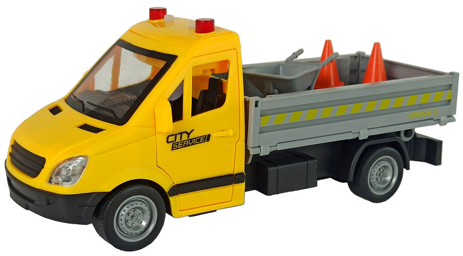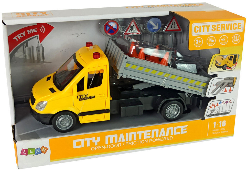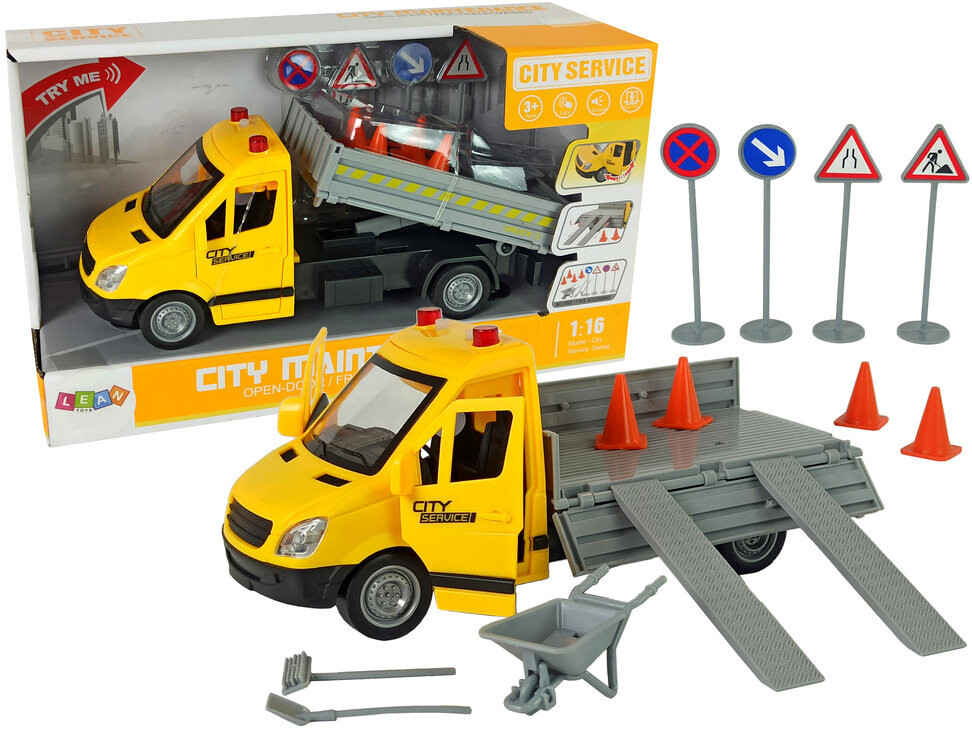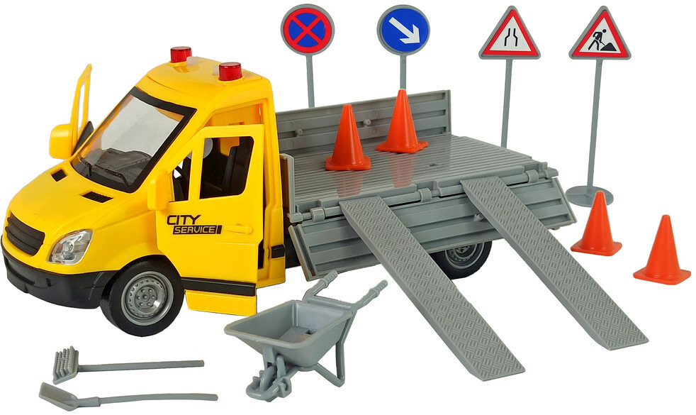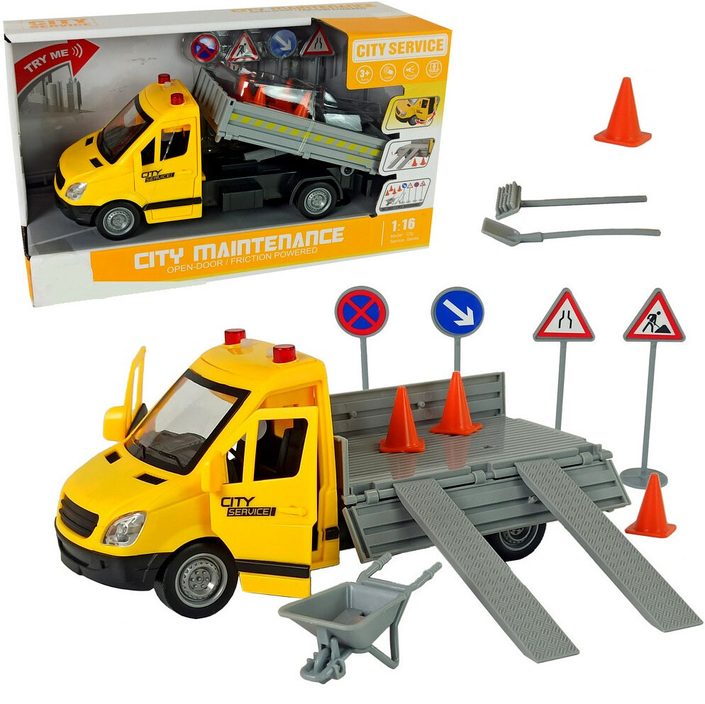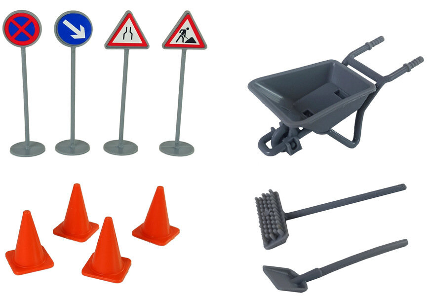 Отлично воспроизведен дорожный автомобиль, зеленый цвет привлекает внимание. В комплект также входят дорожные знаки и тачка. благодаря чему вы сможете обезопасить дорогу и информировать о дорожных работах.