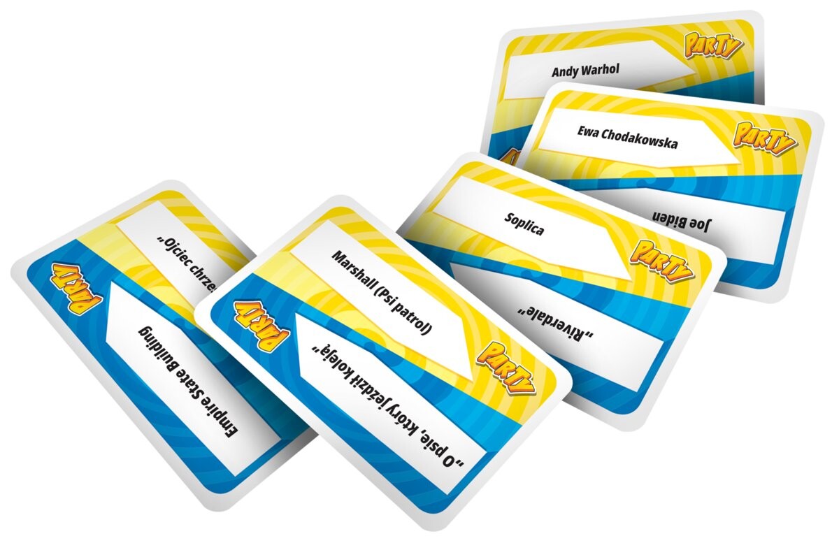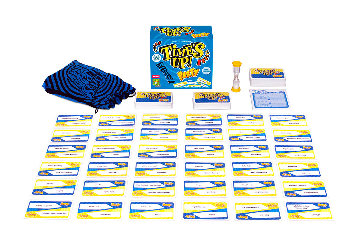 Время вышло! Party (синее издание) включает 440 совершенно новых слоганов, которые еще больше обогатят ваши игры и добавят дополнительных испытаний. Среди них вы найдете имена известных людей, названия книг и фильмов, а также другие выражения, относящиеся к широко понимаемой поп-культуре.О чем речь?