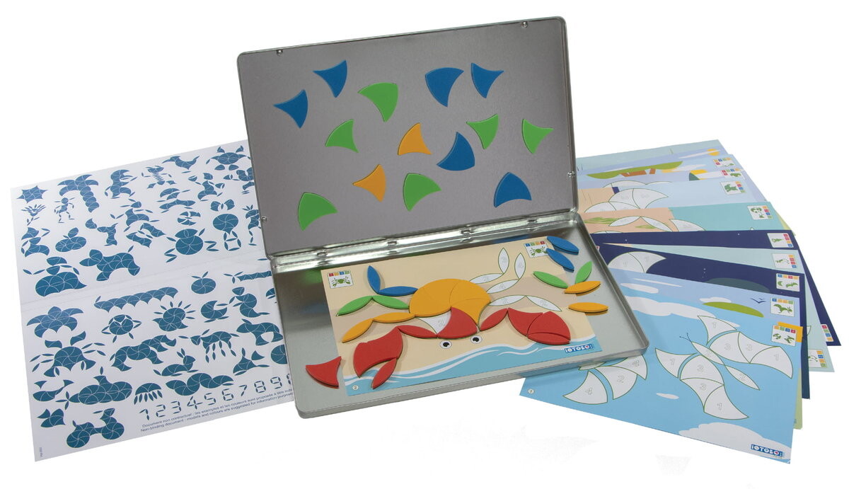 В металлической коробке находится 40 магнитов 4-х цветов и красочные листы с узорами, которые нужно расставить по номерам, а также отдельный лист с дополнительными узорами без нумерации (всего 60 моделей). В игре есть два уровня сложности. Более простой вариант: ребенок выбирает одну из досок, на которой нарисована фигура, разделенная на части, отмеченные цифрами. Цифры соответствуют данным цветам. Ребенок выбирает нужные ему магниты, которые размещает на одной части коробки, а выбранную доску размещает на другой. который будет служить основой для создания выкройки. Более сложный вариант: пустые фоновые доски следует дополнить узором, созданным вами самостоятельно или по одному из предложений, представленных на плакате. Игра практически никогда не заканчивается: помимо предоставленных шаблонов вы также можете создавать свои уникальные композиции.