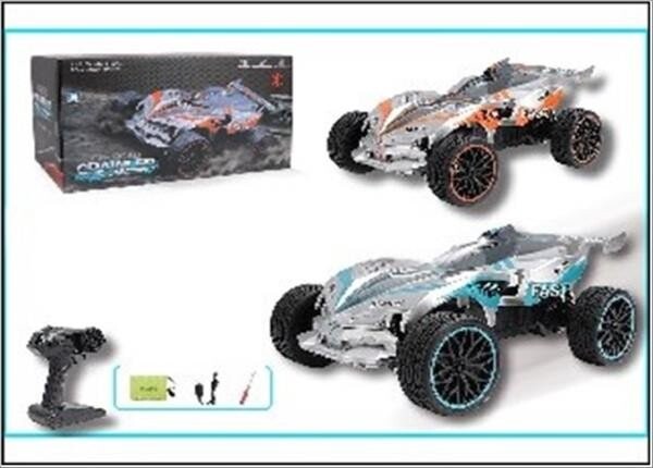 Гоночная машина на радиоуправлении с удобным контроллером. Он оснащен рабочими пружинами и колесами с протектором, позволяющими ездить на нем по различным поверхностям. Контроллер позволяет машине двигаться во всех направлениях.