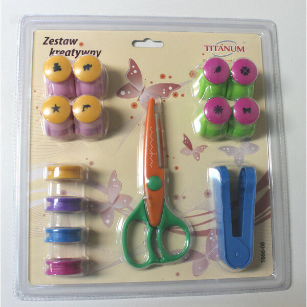 • В набор входят декоративные ножницы, 8 декоративных мини-дыроколов, машина для тиснения бумаги и 4 сменных шаблона для машины для тиснения.