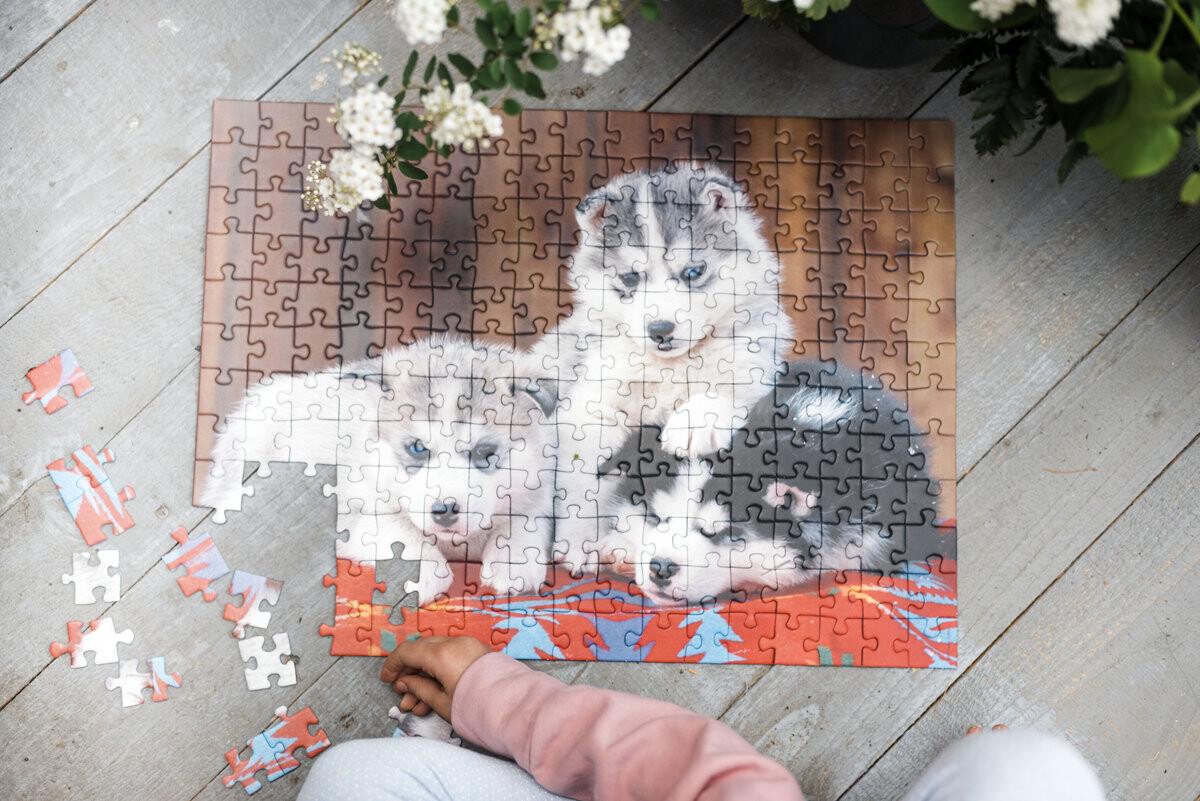 Содержимое коробки:пазл из 200 деталей (размер головоломки зависит от возраста ребенка) с мотивом хаски.