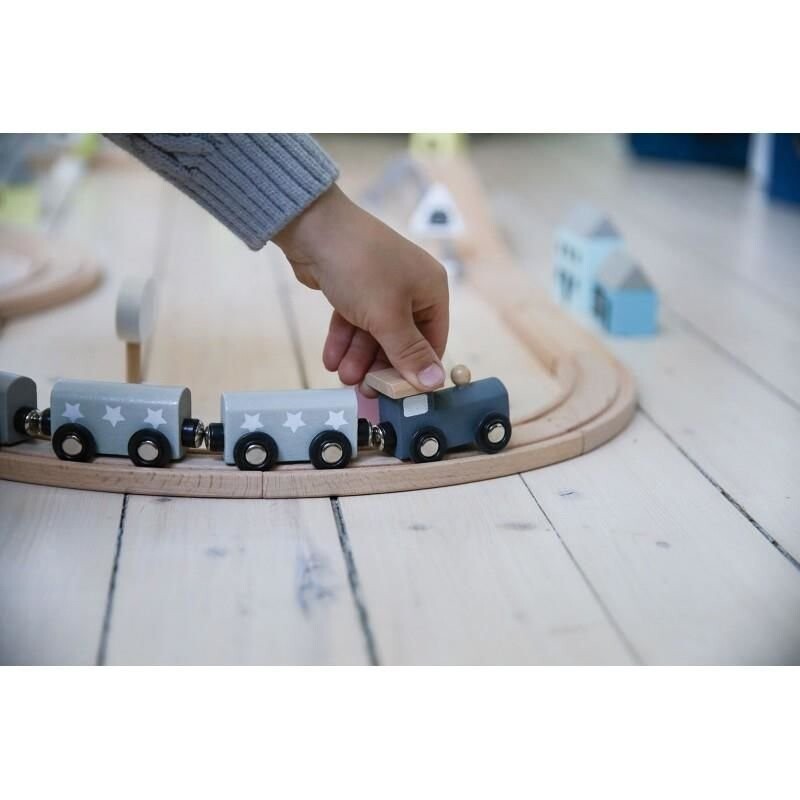 Необычный деревянный поезд пастельных тонов — мечта любителей поездов. В этот большой деревянный набор входят тридцать шесть элементов, шесть зданий, церковь, три дерева, два валуна, четыре дорожных знака, мост, пятнадцать деревянных элементов пути, три вагона с магниевыми соединениями и локомотив.