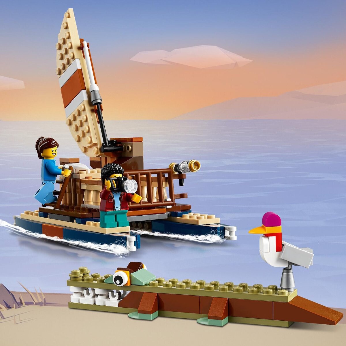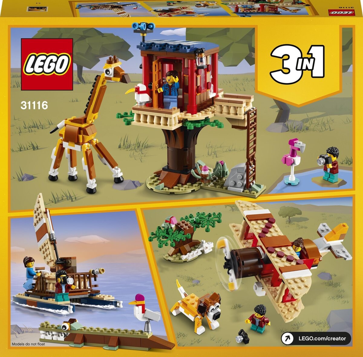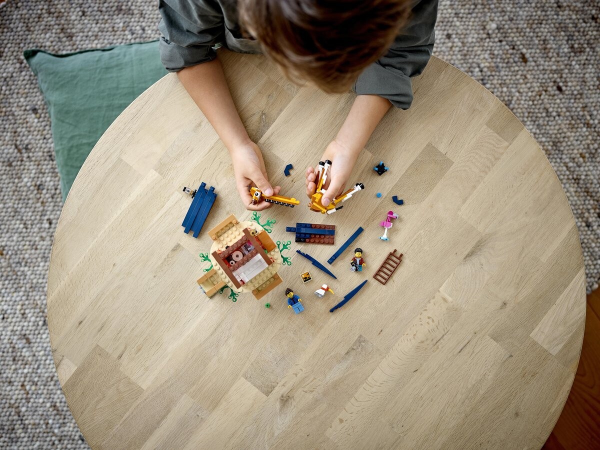 31116 LEGO 3x Safari Fun Детям понравятся приключения в захватывающем наборе для сафари 3-в-1 со сборными животными. Вас ждут великие приключения! Юные любители острых ощущений могут во время сафари построить домик на дереве, а затем превратить его в биплан или катамаран. Домик на дереве «Сафари» LEGO Creator 3 в 1 Множество деталей Выйдите на балкон и познакомьтесь с подвижными фигурками: жирафом и фламинго. Небесные приключения Дети смогут сесть в биплан и пролететь над львом. Отправляйтесь в плавание! Юные капитаны смогут проплыть мимо крокодила. В комплект входят 2 минифигурки LEGO. В комплект входят минифигурки мальчика и девочки, а также кирпичные животные, в том числе жираф и лев, для ролевых игр на сафари. Изучите важные навыки в трех приключениях. Поощряйте детей развивать свое воображение и ключевые навыки, собирая и трансформируя этот захватывающий набор.