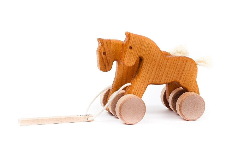 Две лошади бегут рядом и прыгают. Кто из них прыгнет выше? Лошади скачут попеременно. По мере того, как первое поднимается, второе опускается. Вместе они имеют целых шесть колес, оси которых расположены не от центра. Это значит, что колесо вращается не по центру, а по кругу. Когда игрушка движется, она вызывает образ скачущей пары лошадей. Играя с ним, ребенок узнает, как движутся эти животные. В результате он узнает, замечает и ценит их мир. Лошадей необходимо приводить в движение с помощью веревки, заменяющей поводья. Игрушка развивает крупную моторику, задействуя движения тела и рук. Он также может стать вашим спутником при первых шагах.