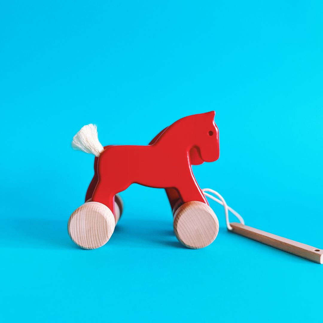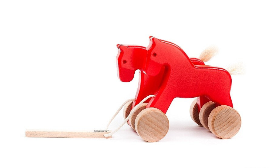 Две лошади бегут рядом и прыгают. Кто из них прыгнет выше? Лошади скачут попеременно. По мере того, как первое поднимается, второе опускается. Вместе они имеют целых шесть колес, оси которых расположены не от центра. Это значит, что колесо вращается не по центру, а по кругу. Когда игрушка движется, она вызывает образ скачущей пары лошадей. Играя с ним, ребенок узнает, как движутся эти животные. В результате он узнает, замечает и ценит их мир. Лошадей необходимо приводить в движение с помощью веревки, заменяющей поводья. Игрушка развивает крупную моторику, задействуя движения тела и рук. Он также может стать вашим спутником при первых шагах.