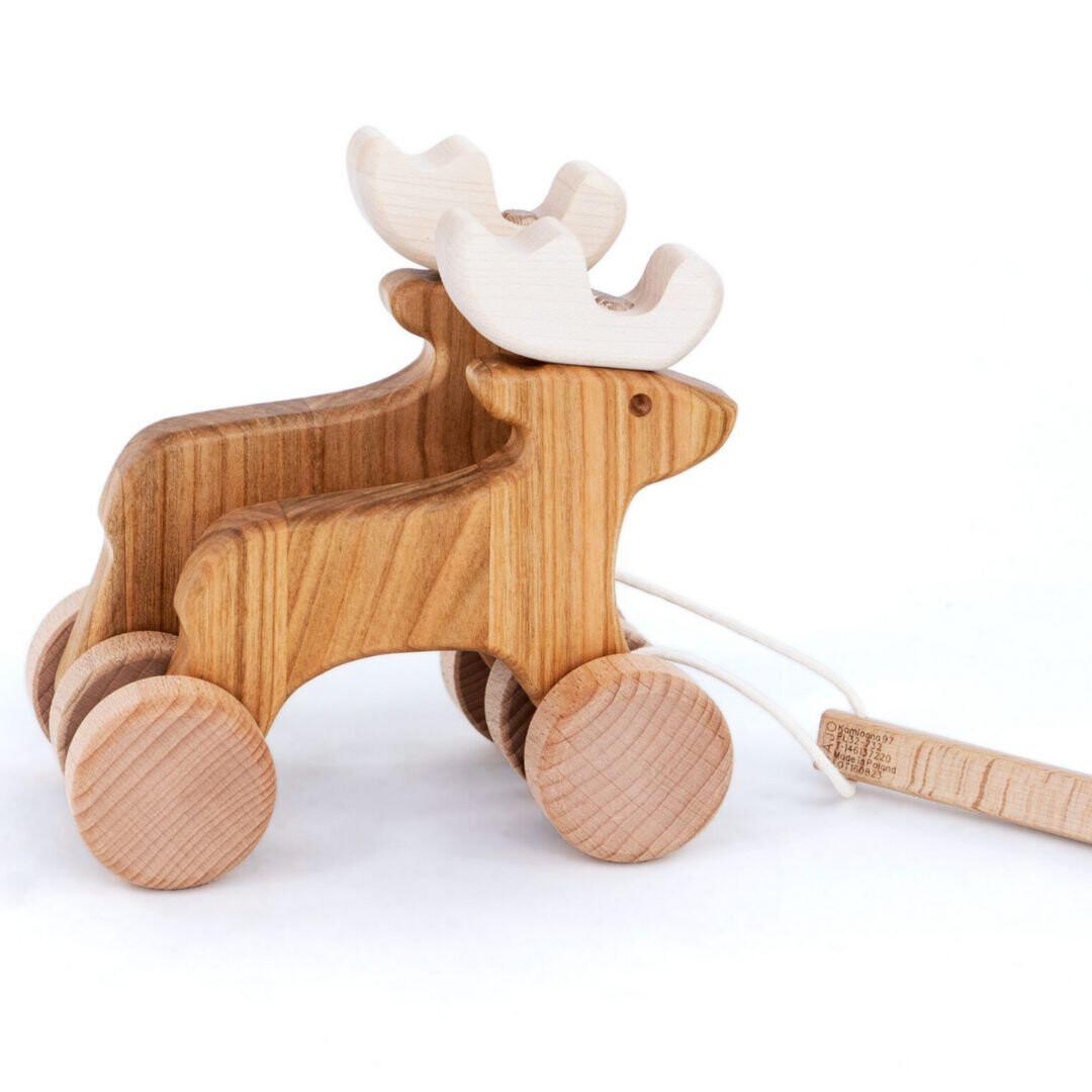 Два оленя бегут рядом и прыгают. Кто из них прыгнет выше? Олени скачут попеременно. По мере того, как первое поднимается, второе опускается. Вместе они имеют целых шесть колес, оси которых расположены не от центра. Это значит, что колесо вращается не по центру, а по кругу. Когда игрушка находится в движении, она вызывает образ скачущей пары оленей. Играя с ним, ребенок узнает, как движутся эти животные. В результате он узнает, замечает и ценит их мир. Оленя необходимо привести в движение с помощью веревки, заменяющей поводья. Игрушка развивает крупную моторику, задействуя движения тела и рук. Он также может стать вашим спутником при первых шагах.
