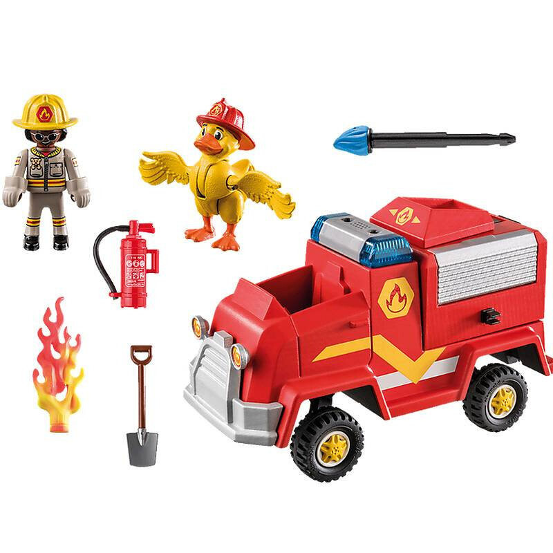 Игрушка Playmobil DUCK ON CALL 70914 Пожарная машина со световыми и звуковыми эффектами. Инновационная система рулевого управления автомобиля предотвращает опрокидывание и обеспечивает огромное удовольствие от вождения. В состав машины входит лифт с водометом, позволяющим отправлять водяные стрелы на помощь в тушении пожаров, а также дополнительные отсеки для хранения необходимого противопожарного оборудования. Размеры: 23,5 х 10,5 х 13 см. В комплект поставки входят: фигурки Фредди Файера и Дакласа; пожарная машина со светозвуковым модулем; регулируемый по высоте поворотный полуприцеп; огнетушительная пушка; другие игровые аксессуары.