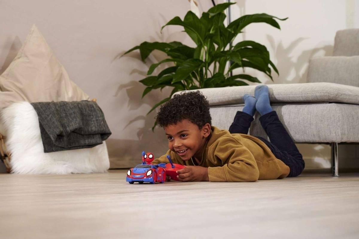 Машина Спайди сине-красного цвета. У него 4 колеса, которые позволяют ему передвигаться по различным поверхностям. Управляется с помощью пульта. За рулем находится Спайди - фигурку невозможно снять с автомобиля.