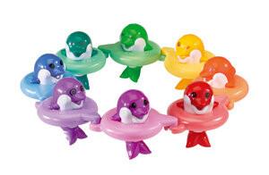 Дельфины, цвет которых нужно подобрать к соответствующим кругам, а затем соединить все круги в линию или круг, плавающий в воде. Каждый дельфин издает разные звуки, если постучать по голове.