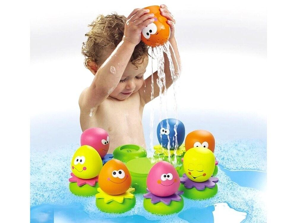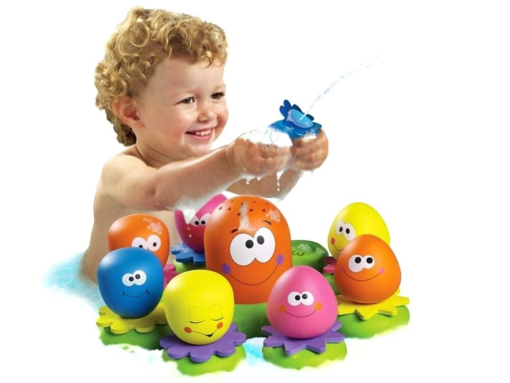 Набор доставит массу удовольствия во время купания! Все осьминоги образуют остров, плавающий на воде. Можно отделить большого осьминога и начать лить и лить из него воду. Осьминоги меньшего размера могут нырять и брызгать водой.