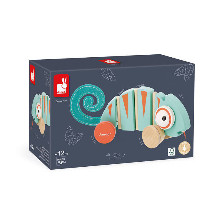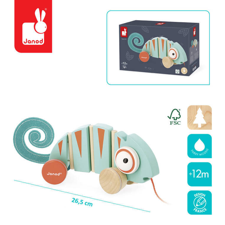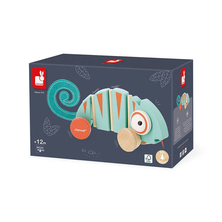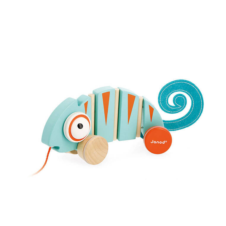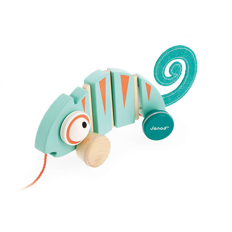 Деревянный хамелеон для катания серии Тропик от французского бренда JANOD станет отличным спутником для первых шагов ребенка. Он эстетичен и имеет красивые, заряжающие энергией цвета: бирюзовый с деталями теплого оранжевого оттенка. Большие выпуклые глаза и завитой войлочный хвост добавляют ей очарования.